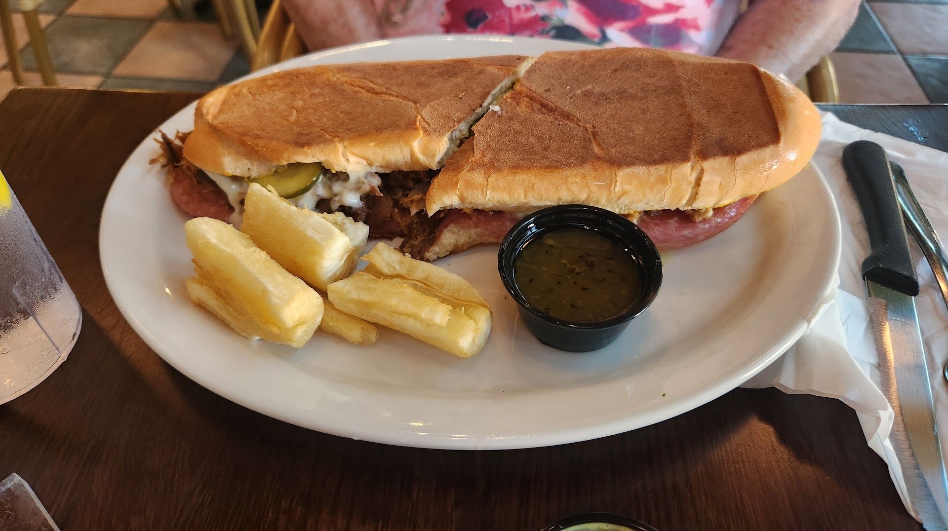 Read moreThis was my first time here. The overall look of the place is fantastic! Light with a big glass front. Tropical wallpaper with great pictures on the wall. The staff was very friendly. The waiter was very attentive and personable, really engaging. He was very knowledgeable about the menu. Now for the food... the fried plantains and green creamy cilantro sauce (!!) were so good and fresh. The cuban sandwich was HUGE, two people could split that sandwich. My chicken dish was good. Made me think of homemade fried chicken. The only draw back was the seasoning. The food was good but lacked a burst of flavor. I will say the clear green sauce that came with the meals (I don't remember what it's called) but it was made with tomatillos and lime (I think?) was so good. It really had a strong lime/citrus bite to it. I would recommend checking this place out. Be adventurous...the menu has a lot to...