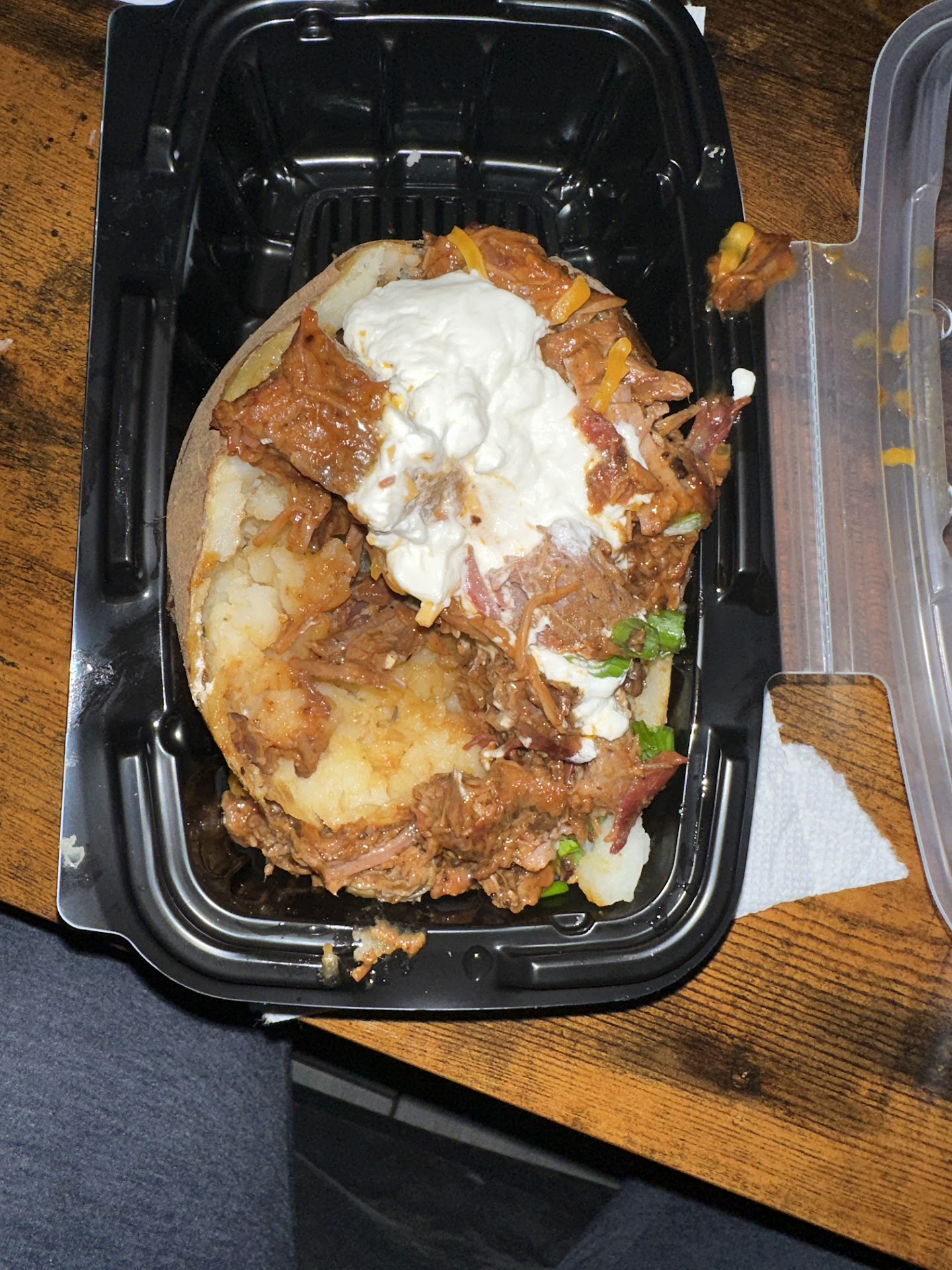 Read moreI’ve made three visits to Queen’s and have never been disappointed. This visit didn’t rate the 5 stars they usually score and I’ll tell why below. Queen’s has a bar for those who need beer with your Q. And it’s a pretty complete BBQ menu you have to pick from. This time Judy ordered a pulled pork loaded baked potato and I ordered an au jus loaded baked potato with a sausage add on. Big. We both took half home. Neither of our potatoes were steaming hot or even hot like you’d expect baked potatoes. They were warm enough to enjoy and we didn’t complain. The pulled pork potato was smothered in a sauced pulled pork. Hard to judge the taste of the pork but you could get a taste sometimes but the sauce was tasty being of just the right heat and sweetness and other saucy nuances we all like. The other part of the load — scallion, butter, sour cream, shredded cheddar — good and fresh. The not-hot potato couldn’t melt the cheese well tho. The au jus potato was topped with all the loaded ingredients and then with 4 slices of good tender barked brisket. Nice. The sausage was diced over all. Then the whole was doused in beef au jus. The sausage was mistake. It was a mistake to dice it and a mistake to order it since it was garlicky like polish sausage and didn’t have the smoky flavor I wanted. Will I go back? H**l yes. But if you go do your own saucing in your pulled pork and all your...