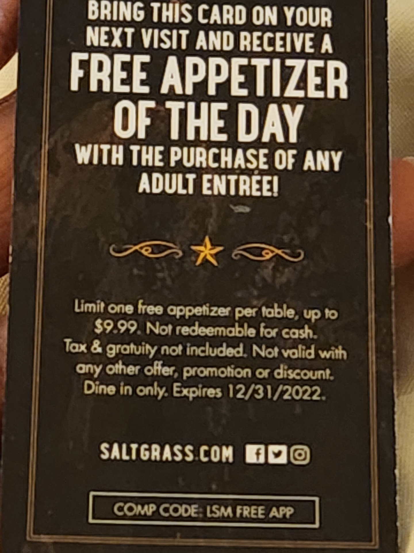 Read moreI do love Saltgrass, and Galveston. But yesterday afternoon, there was a general air of "resting on their laurels." The host seemed bored and seated us right next to another occupied table, chairs bumping, although there were plenty of open tables, then seated the next group right next to us on the other side, chairs bumping. He plopped the menus and pile of napkin-wrapped flatware in the center of the tables when seating, and walked away. Our server, who said lots of silky, friendly-sounding words, seemed to "know best"... I asked to see a menu again, to consider a dessert, and she said, they're not on there; we have thus and so. I said I had seen desserts with calorie counts on the menu, so she acquiesced and brought one, saying, well, they used to be on a separate card. I asked for a small to-go box for about 4 baby-back ribs; she brought a large box; I asked if they had s small box; she said yes, but, the ribs probably wouldn't fit; I asked if I could please have a small box... the ribs fit perfectly and the box closed easily. Small things, but there's polite service and then there's "polite-sounding push-back." I'm 72; I prefer polite service. I do appreciate Saltgrass' Lunch & Early Dinner specials, where I made my selection; my husband ordered from the regular menu. My baby-backs were tender and delicious. The green beans, too, were cooked to perfection... but, highly over-seasoned with their seasoned salt. Our server did request a less-seasoned order for me, which were perfect. My husband asked for a char on his steak; it was cooked to his specified rareness and looked charred, but it was actually blackened to give it a charred look... not the same, and definitely not what he would have agreed to, had our friendly-sounding server explained it properly. A note about restaurants in general... please stop marinating everything... you're adding unnecessary sodium to our diets. Natural chicken and pork might be a little slower and trickier to cook, but we, your hardworking customers, are worth the effort and deserve a healthier, more natural...