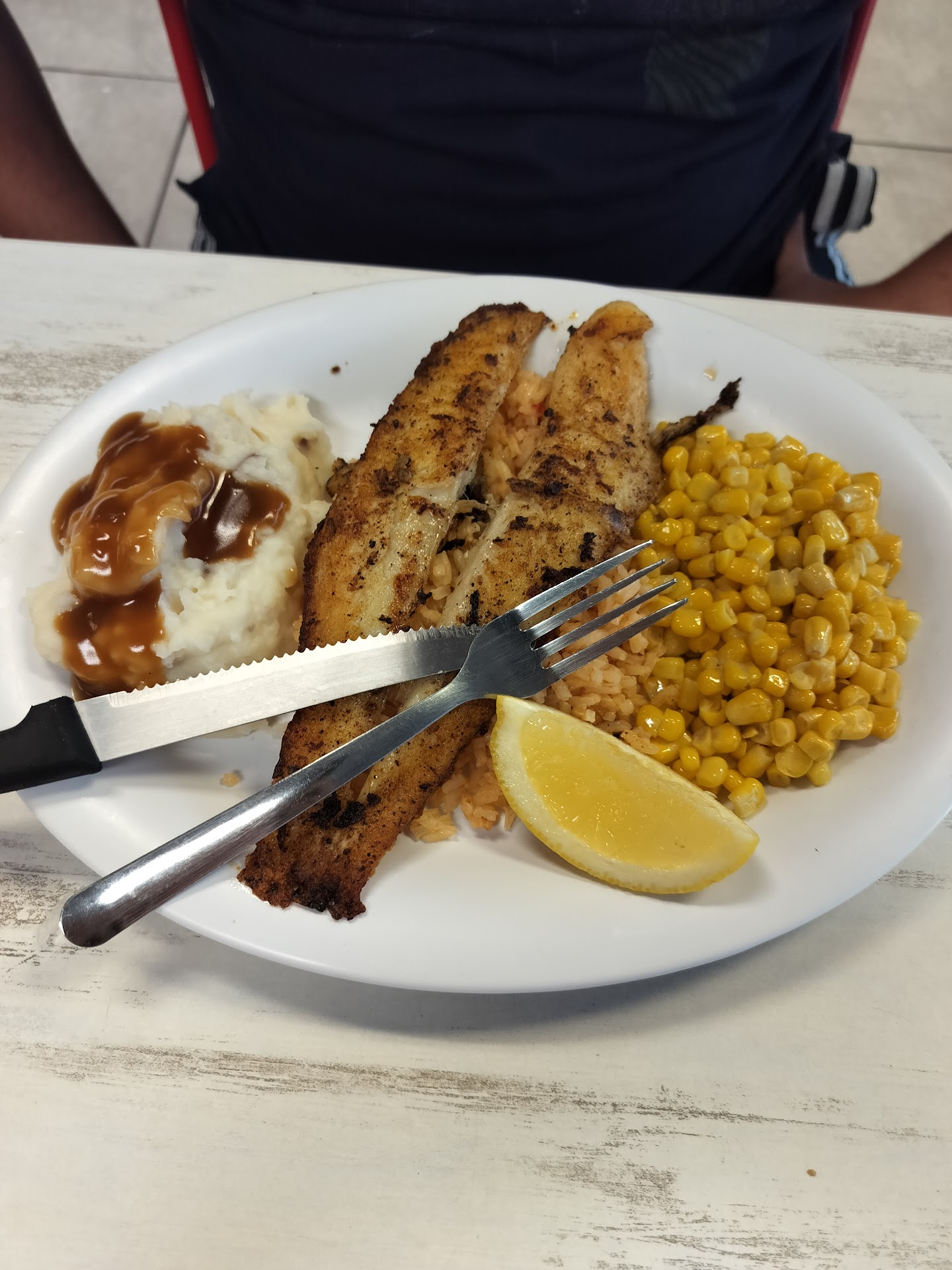 Food - 5/5 taste. We got a combo basket and a catfish plate. The catfish absolutely melted in my mouth and everything was well seasoned. Shrimp was crunchy and delicious. Fries are well seasoned. Coleslaw was yummy. Unfortunately I wasn't given the hush puppies that the menu said came with the combo basket, but honestly I didn't even notice until we left since all the other food was so good lol.