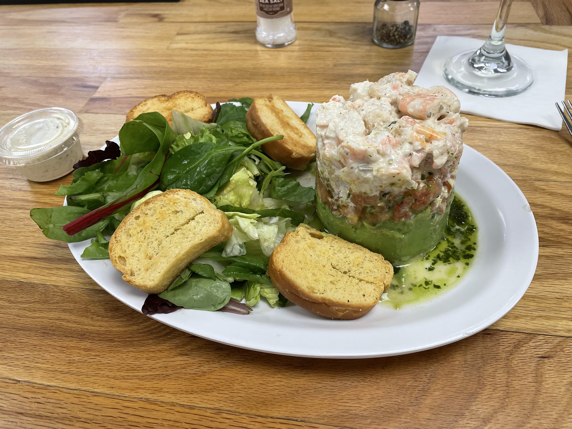 Update: I tried the Shrimp Salad Stack today. Oh my goodness the delicious. A side salad of mixed greens, crisp toast points and a tower of avocado, tomato and shrimp salad. I asked for a ride of remoulade instead of the Italian but it comes with an olive oil pesto underneath the tower of deliciousness, so I really didn’t need the remoulade but theirs is so good I ate about half. Paired with a super cold Sauvignon Blanc and RhaeVaughns smile and subtle attentive waiter style…I was a happy camper. He always says “see you tomorrow” which I find endearing, confident and thought provoking. Everything super fresh as always! 5/26/25 We were hot, hungry and sweaty after walking from the Strand to the SeaWall and back. Yulia got us water, wine and tea pronto! I had the shrimp stack (my go to)!and husband had the cold boiled shrimp. Perfect! Fantastic as always! Rhaevaughn’s ready smile and “see you tomorrow” base...