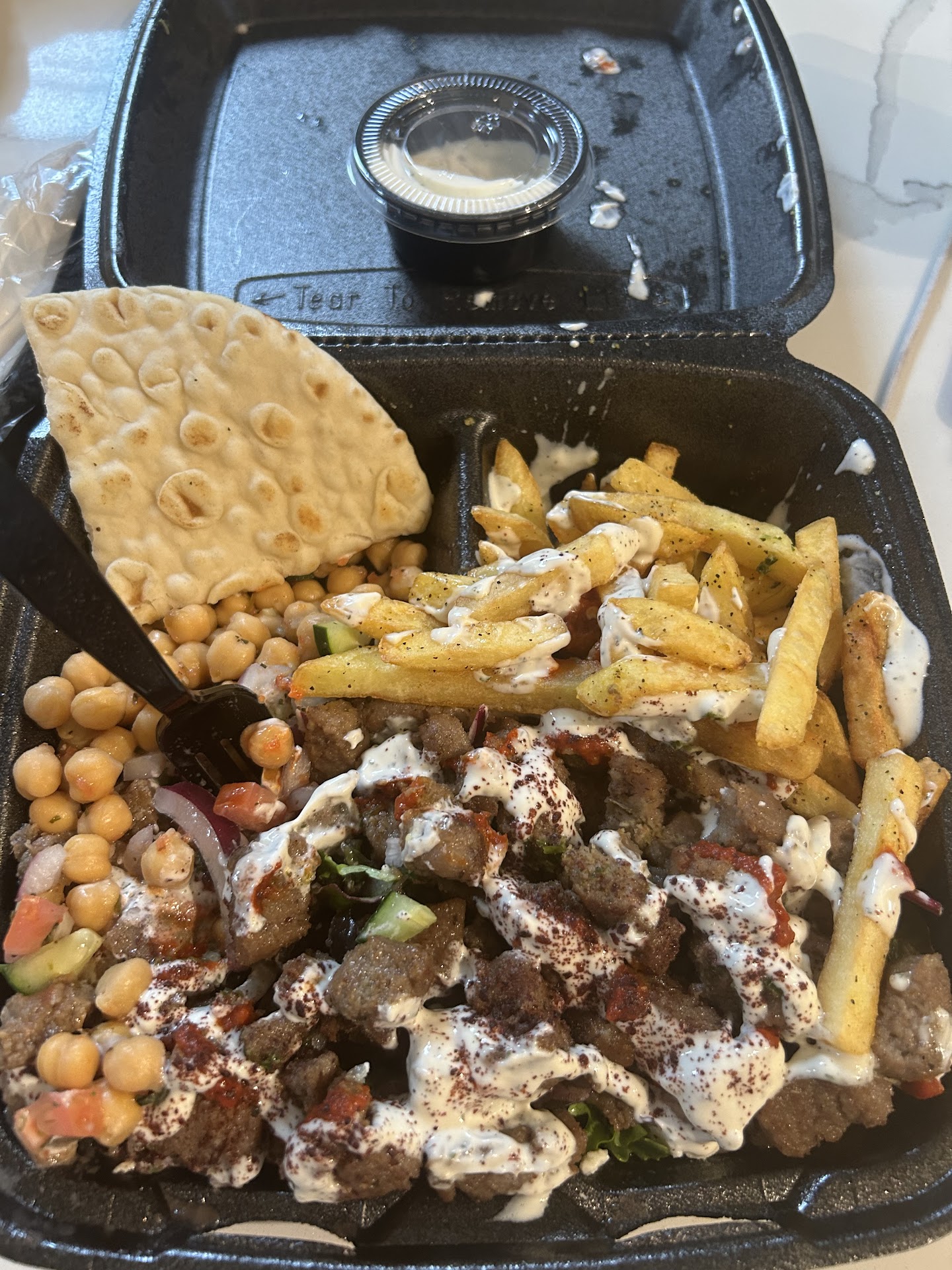 Sure, it is in a gas station but what lacks in atmosphere is made up in flavor and value. $13 a meal and I had plenty of food; I was full before finishing it all but kept on eating because it was so flavorful. We had the gyro and Shwarma wrap, fries, eggplant salsa, spicy. The shwarma was moist and herby (mint?) and the tomato chili sauce was to die for. The whole meal was delicious and I will dream of the deliciousness. I don’t know what type of cuisine it is, but I want to google it (Greek? Lebanese? Saudi? Afghani? No idea) to try and recreate it. But then maybe I shouldn’t and should stay away, as I’d gain tons of weight eating it all. Everyone who likes flavorful food should try...