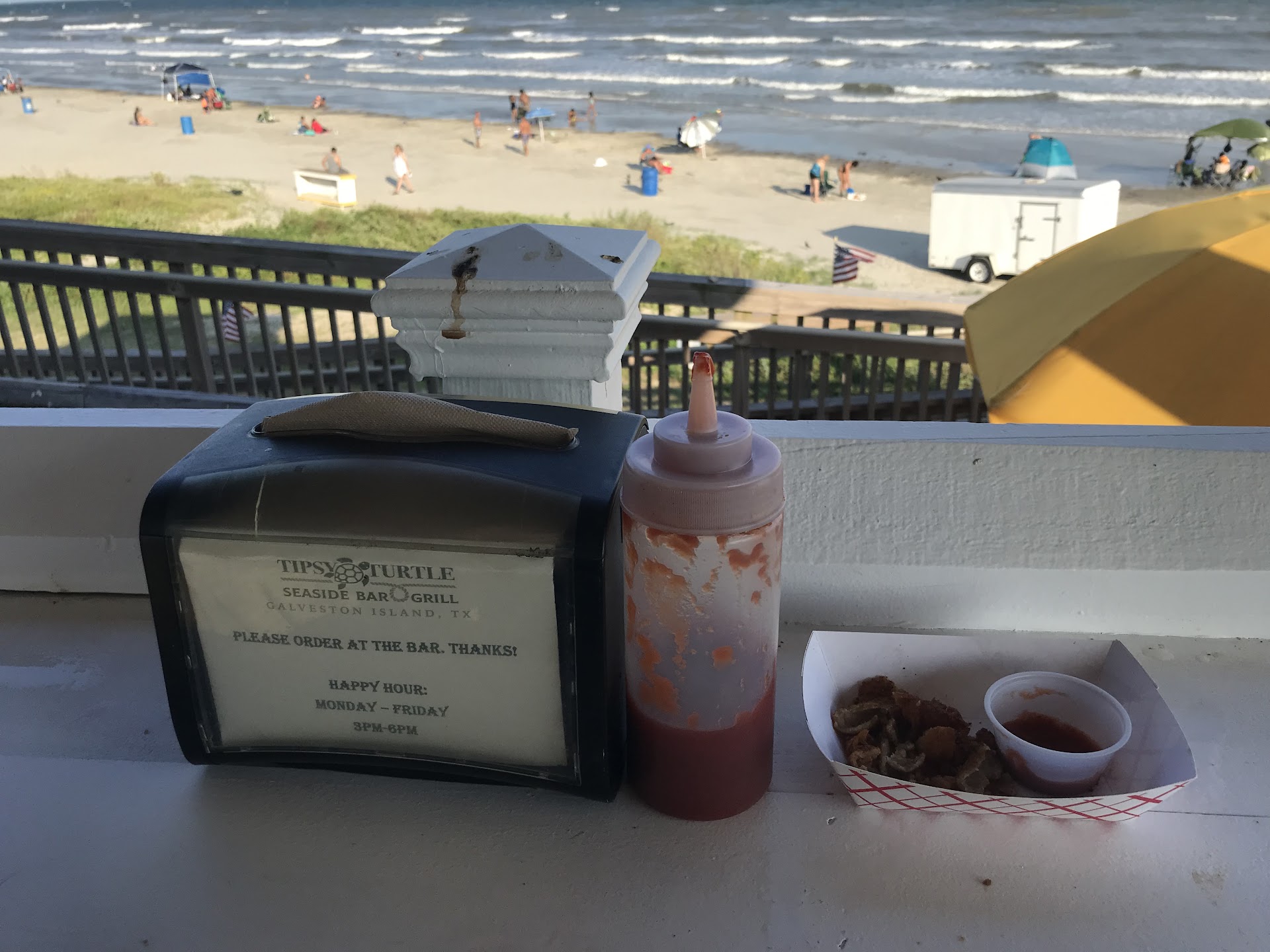 On a positive note, the establishment has a beautiful view of the ocean. However, I was disappointed to find that the bar top seating was covered in bird droppings. Itâs the ocean, so I get the seagulls, etc. However, bird droppings and spilt ketchup/food should be handled more routinely instead of a snarky sign that reads âyour momâs not here, clean your own messâ. This oversight detracted from the overall experience as we waited for our food.
