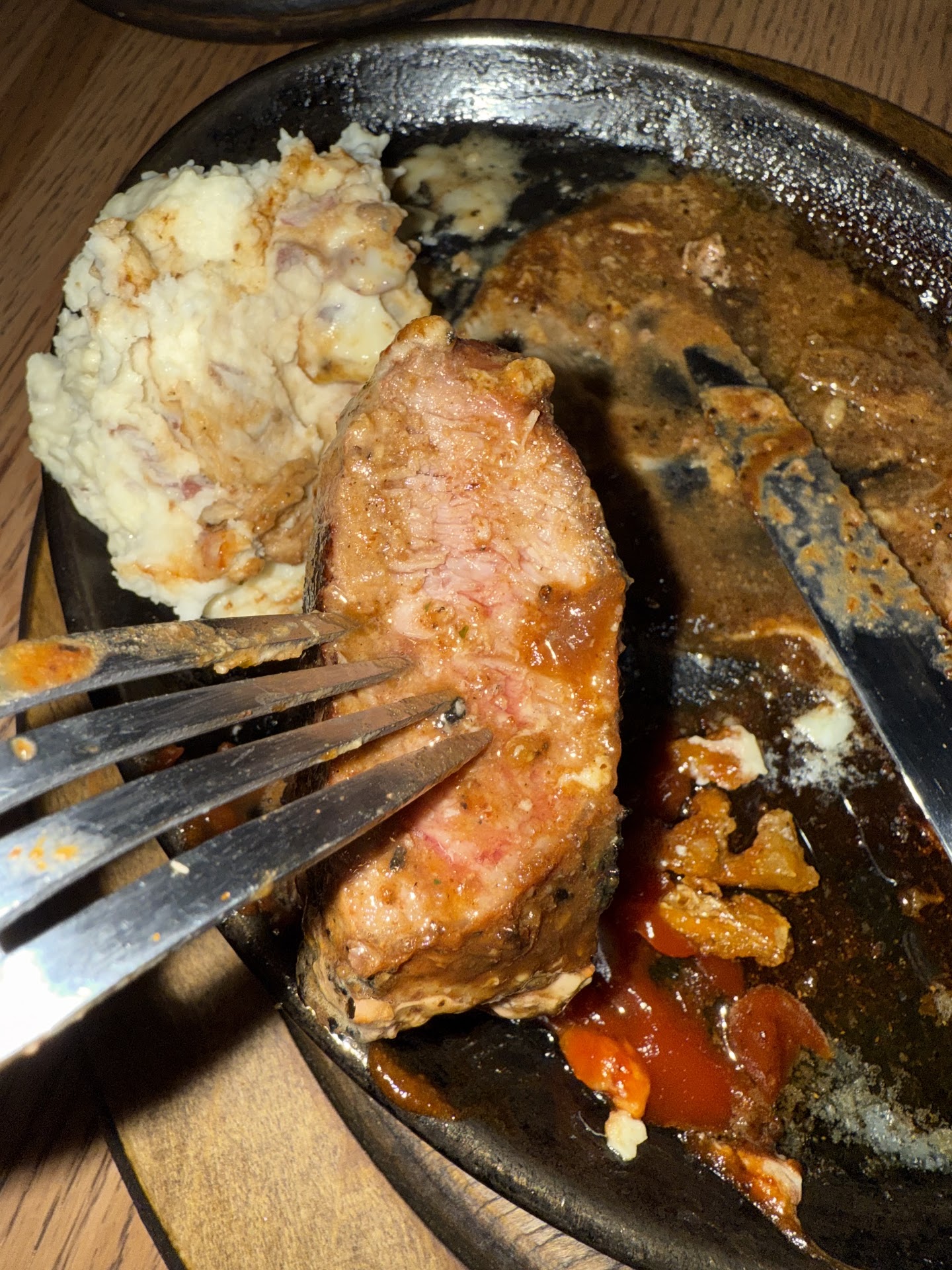 Oh my gosh, let me start by saying that my friend and I, just two people, were seated at a high-top table. It took them an astonishing SEVENTEEN MINUTES to even ask us for drinks! By that point, we were already certain about our orders. We decided to go with a 2 for $25 skillet steak, opting for a rare-medium steak. The server then inquired if we wanted shrimp added to our steak, and we simply replied, “Just what comes on the steak.”