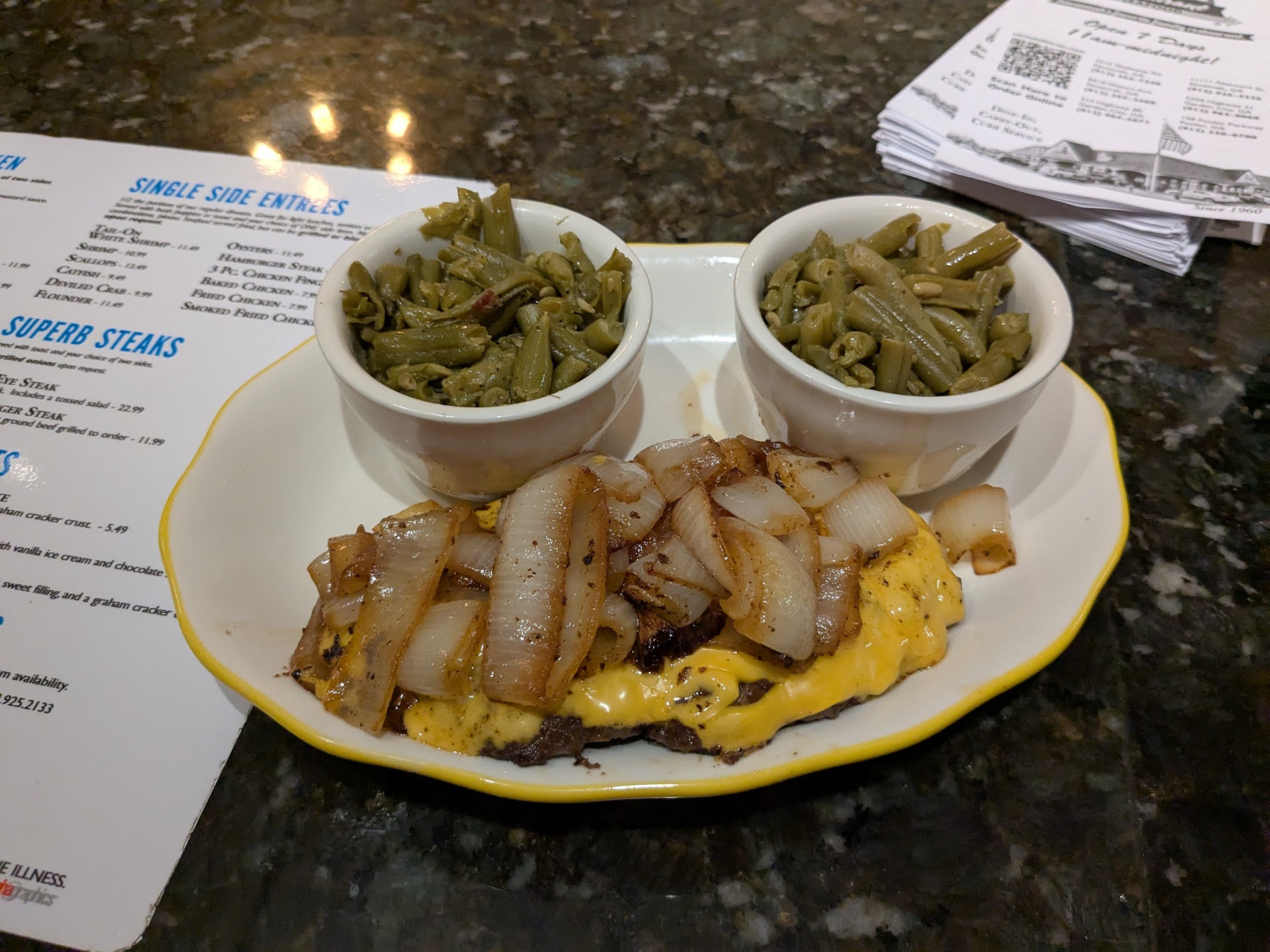 18 May ā25 ordered hamburger steak, baked potato, coleslaw. The potato was small but hot and was the best part of the meal. The coleslaw was coleslaw. The hamburger steak tasted a little like soap and had big chunks of black crispy stuck to it like it was cooked on a dirty grill. The black crispy chunks were hard as rocks. Couldnāt eat it. The server had the personality of a robot but she did put everything I asked for in the bag.