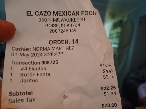 Read moreVERY RUDE. I noticed that their menu has an item that another popular Mexican fast food restaurant here in Idaho has. I asked what goes on it and the young lady at the register did not know, then I asked if it was anything like the same item at the other restaurant, she did not know so she asked the cook. The cook came out, shouted at me and said, "This is not (other Mexican restaurant), this is El Cazo Mexican Restaurant, I dont know what the other place is or what they have, this is El Cazo Restaurant, ok?," then proceeded to tell me what goes on this item. She then went right back to the kitchen. It was so dramatic to the point where people standing in line made comments to me saying there should have been no reason for my question to get such a rude response. I told the young lady at the register, who was very sweet and embarrassed, that I wanted to switch my order after learning what goes on it, the young lady went back and told the cook, young lady came back and said that the cook said she was already making the fries so I couldn't switch. I WILL NEVER AGAIN COME TO THIS RESTAURANT and I am for sure letting friends and family know about...