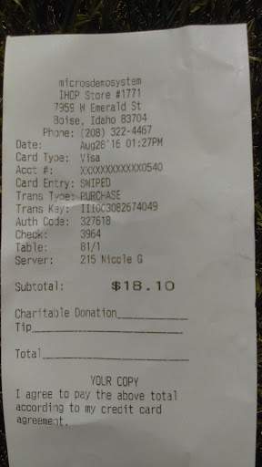 Read more(Update: not only was I charged for food I didn't receive, but my bank is showing a pending charge that is $3 higher than my receipt said I was charged. When I called to talk to the manager, he was too busy to talk and requested that I call back another day!!) At the emerald rd in boise location, they rarely answer the phone on the graveyard shift. If I order over the phone, I can get exactly what I order. But, when they won't answer, I have to order online. And everytime I order online, if I change something, or add something, I get charged for it but don't actually get it. Three times now, I have ordered the breakfast sampler with extra ham (or ham substituted for sausage), and paid for flavored pancakes. But have received the order exactly as it is on the menu (meats exactly as the menu describes and original pancakes). I don't know if the cooks are just reading the item and not bothering to scroll down, or if their system isn't printing out the changes and additions, plus the server doesn't verify the order. Either way, I am usually at home when I see the order and have no desire to go exchange it (plus I can't exactly call to complain, since they weren't answering to begin with). So, just a head's up, if you order online, just order exactly as stated on the menu, don't make changes or pay for additions, you'll just be wasting your money. (Additional note: sometimes I pick up my food, sometimes I have it delivered. When I pick it up, I have never seen more than 4 tables occupied, so it's not like they can blame it...