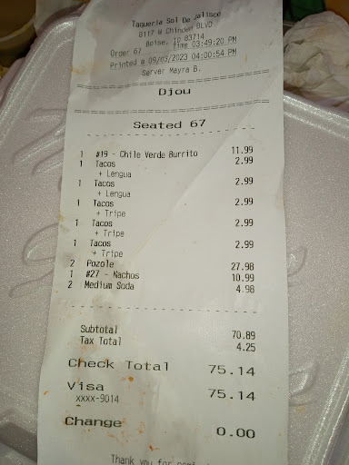 The food here is beautiful and large portions but unfortunately it lacks in flavor. We ate tripe tacos that were extremely salty, tounge tocos that were just ok , pork posole that was beautifuly red with very tender pork but was flavorless in exception to the red chili that colors the broth, we had carne asada nachos that were beautifully presented piled high with meat ,Colby jack cheese, onions, sour cream ,and jalapenos but they were cold and lacking in deep flavors , we also ordered a shredded beef burrito with chili Verde pork sauce but they gave us enchiladas instead, the beef was tender but lacked in deep flavors the chili Verde sauce had chunks of tender pork but the sauce was sweet and was not pleasant. The positive to this was they have all you can eat self serve warm chips and a selection of salsa's that were good. The atmosphere was very clean and nice and the staff was helpful and friendly. I gave this place a 3 star for the chips and salsa and cleanliness but the food was not even worth saving as left overs. Cost of food was...