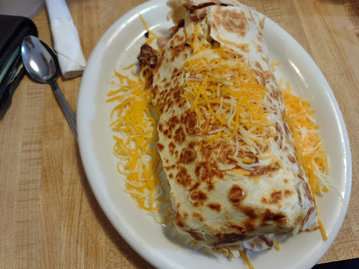 Onto the main event: The "Gutbuster". It was perfect and lived up to it's name. The burrito could barely close and was at least as big as the plate ( about 12") covered in cheese. It normally comes with country gravy, but as I don't care for gravy on my burrito I gave it to my wife. The meat was fantastic and was well flavored, having ham, bacon, and sausage. The eggs tasted as if they were done "dirty", as my grandfather would say, and brought me back to childhood. Added a bit of sour cream to the mix and it was fantastic. Needless to say I did not finish. (Photos attached)