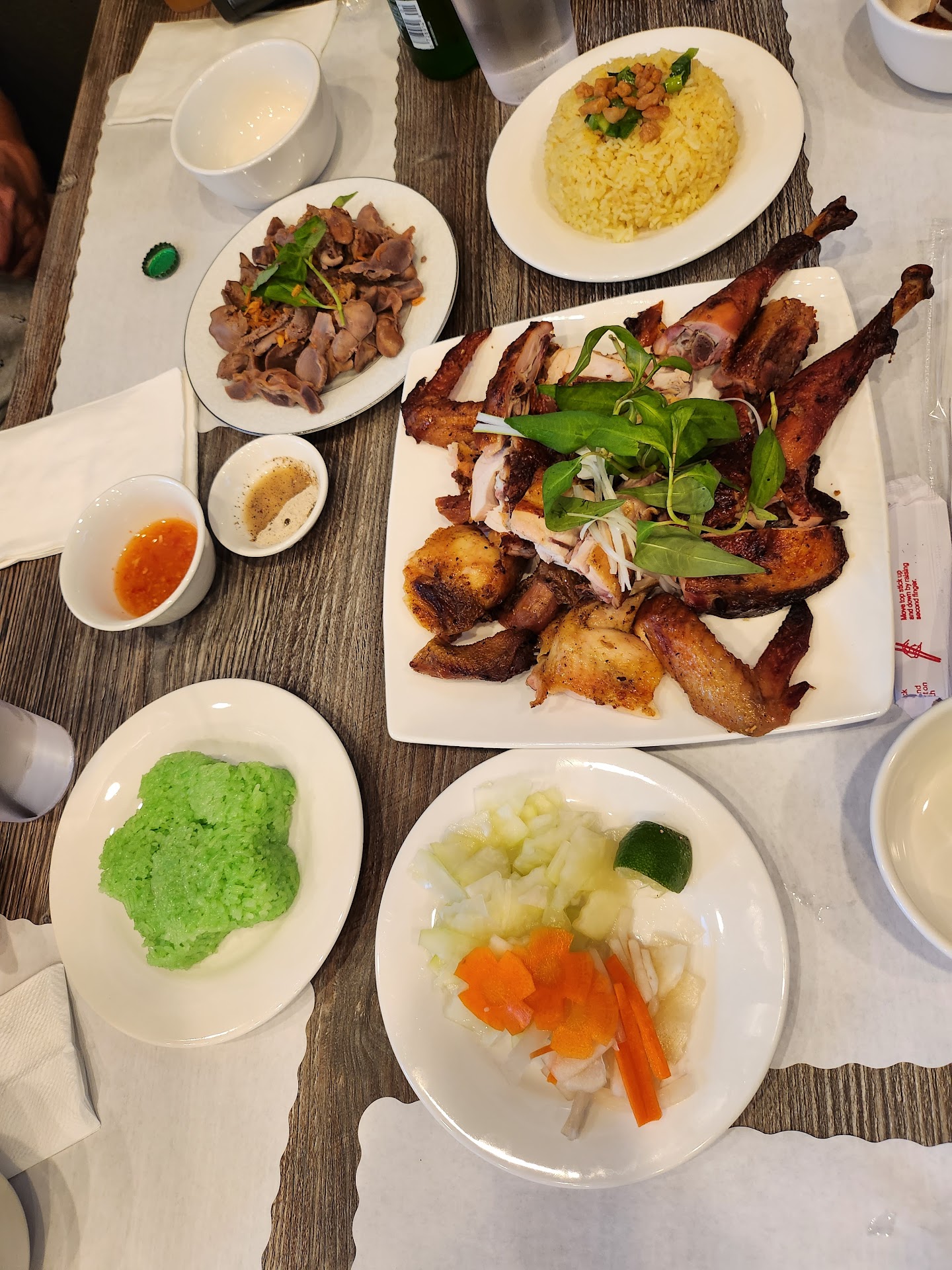The food is outstanding with com chay and xoi la dua combine with Ga Nuong Lu, they have the sauces for the ga and the daikon and raddish + veggies to wrap with.