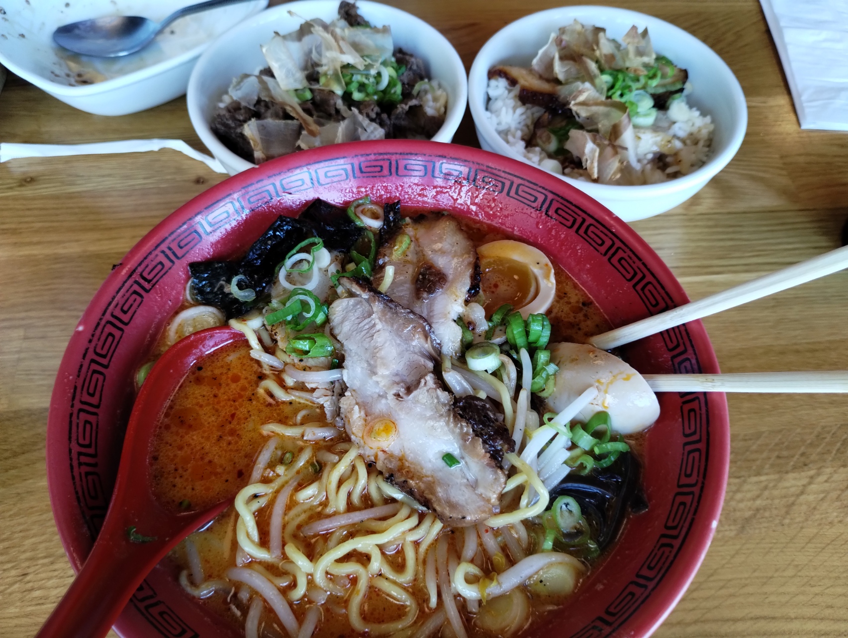 Food came in large portions. My tonkotsu ramen had a very rich pork broth to it. The pork itself was extremely tender and moist. Definitely add some corn to your ramen for a $1 more. I also added 2 dumplings to my ramen for $2. Pricing is very similar to other ramen locations, about $10-$13 per bowl. Luckily, most bowls already come with an egg, so no need to order them as extras. If you prefer your ramen on the spicer side, they bring out chili oil to your table.