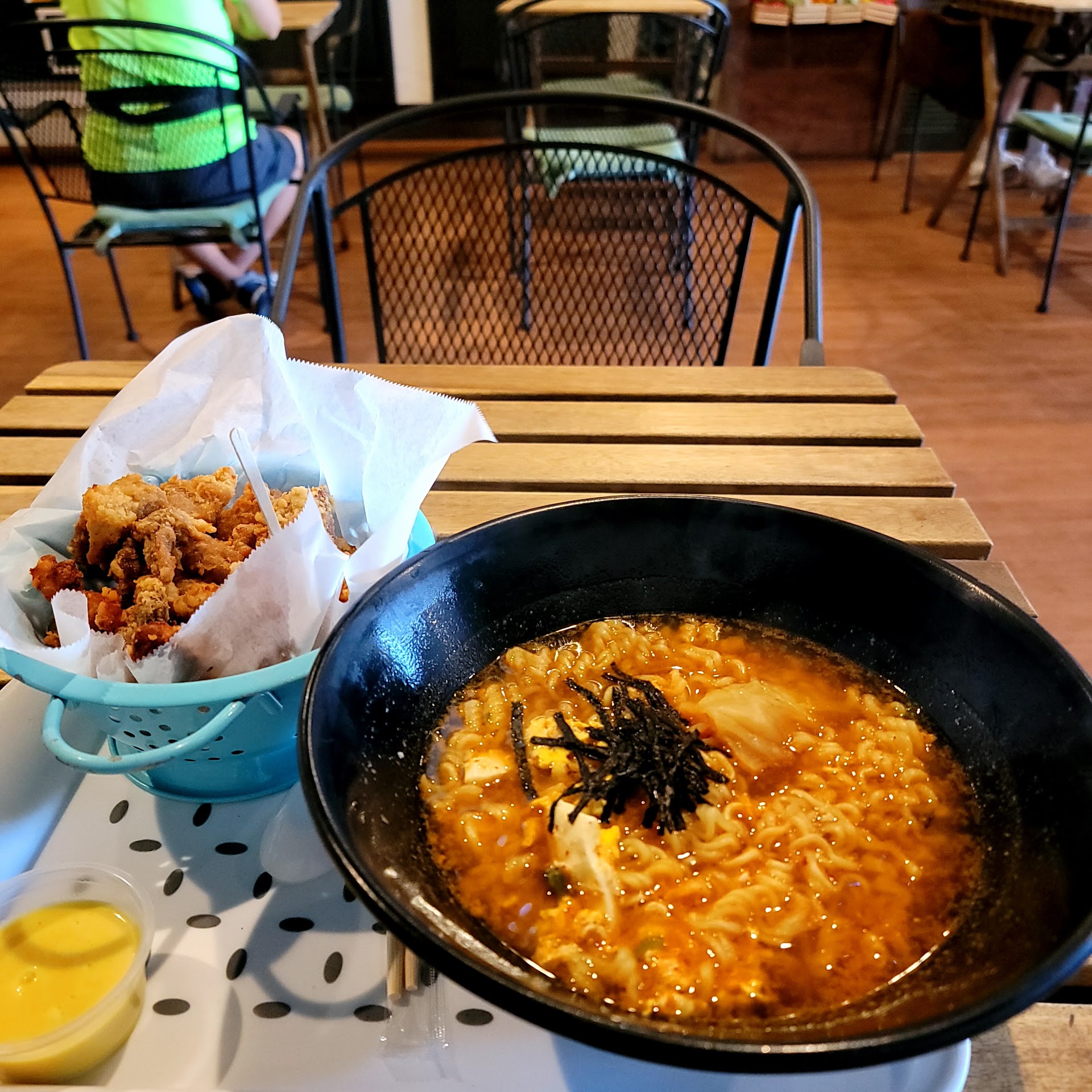 Very quiet and dainty cafe that serves both hot and cold drinks, and delicious ramyun ❤️ I ordered the ramyun since I was craving it, and ordered some popcorn chicken for some extra protein. Decided to have something for dessert because why not? Although I was caught off-guard with the flan, it is served as a drink and not as a, well, flan. The cashier kindly gave me that heads up and I appreciated her for that. I went ahead and ordered it because #yolo and and happy to say that I still enjoyed it as a drink.