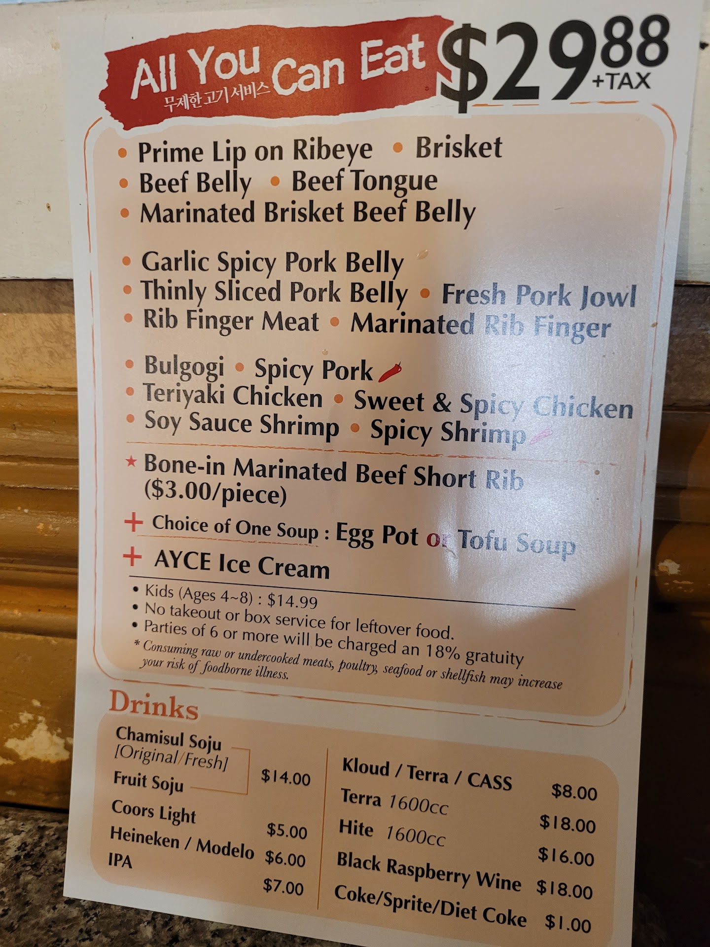 (2) Service: rules, attitude, and delay. Two family on 2 separate table on 2 separate checks, but why do we have to order the same menu? That's ridiculous? Even an AYCE sushi place will let you mix entry with AYCE at the same table. Service is slow. When they do stop by, they dont care to listen, then forget to bring things.