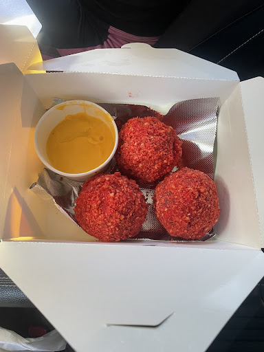 As for the food: the asada crunch wrap with Hot Cheetos was actually pretty good. But the Hot Cheeto balls were a big letdown. They didn’t look anything like what’s advertised on their Instagram…no toppings, overcooked on the outside, and the meat inside was dry. I was especially excited to try those based on the videos I’d seen, but they were nothing like what’s shown online.
