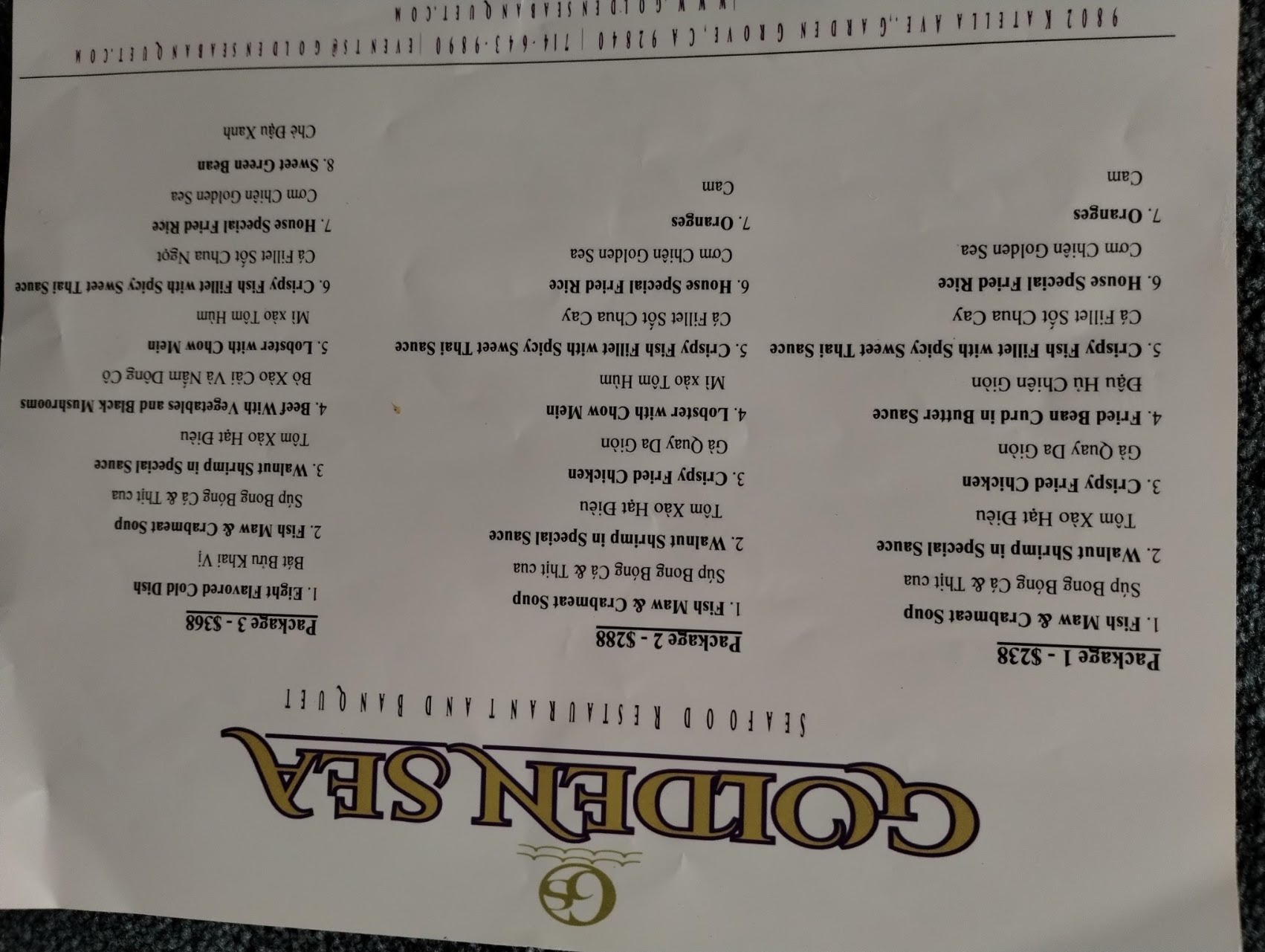 They serve 7 banquet menus for tables of 10; starting at $238 with 7 dishes. The $286 has Maine lobster with lo mein noodle, also fish maw soup, walnut shrimp, deep fried whole chicken, deep fried fish filets with mango chutney, fried rice ect. Top wedding menus are in $500-600 with exotic and expensive ingredients. Large sales meetings have been known to order low cost menus with only 2 dishes.