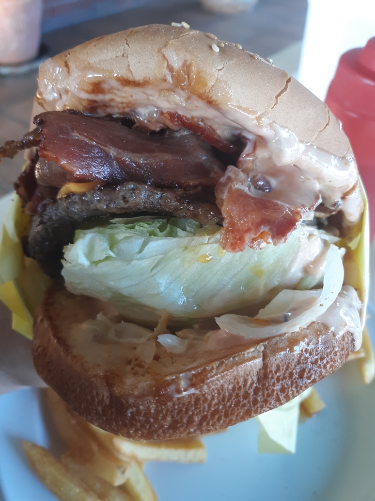 Smaller place with plenty of parking. 2 TVs on inside and people working behind the counter were very friendly. Place has ceiling fans and was a bit quiet. Many delivery drivers picking up orders as well. We ordered water and they asked if we wanted ice and lemon, which was nice. I ordered rib eye steak and eggs with house potatoes and no veggies, sourdough toast. Hubby ordered French toast with no sugar, eggs and extra crispy bacon. Plus an avocado burger. Prices are reasonable $34.58 for everything and portions are decent. They even gave me a sample of their cucumber lime water which was good but too sweet for me to drink an entire cup. Food was fresh and meat was juicy. Hamburger was good as well. We will...