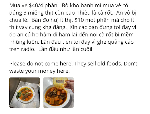 This place really sells spoiled food, only learnt it with my own experience. I should had read the comments before coming to this restaurant. I saw the ad on Facebook for buying any two “banh tet” or “banh chung”, get one free “dua mon”. Since I always want to try and motivate new restaurants, I ordered total of 2 banh tet and 2 banh chung from them a week before Lunar New Year to send them to my relatives. I came back to buy another pair of “banh tet” for another relative. I asked the cashier how long the cakes been there. He told me they had been there for a week. I was hesitated to buy but he told me the cakes should be good for a long time more. Trusting him, I bought another pair. My relatives kept the cakes in the refrigerator and only took them out the day before Lunar New Year. They cut and tried them on the third day of Lunar New Year and found out they were spoiled. Not only they were spoiled but banh chung were not fully cooked. I called the restaurant to complain and the first thing they ask if I have a receipt and that I’m the first to complain. There’s no apology and it made me feel like I made it up. I told them I don’t have the receipts anymore but I paid by card so I can show them the transaction. They then called me back a day later telling me if I can bring the cakes there, they will refund. Shoot, most of them were tossed away in the trash bin. I had to drive to my parents to retrieve 1 banh chung and 1 banh tet which were not tossed away yet. Got a refund for $35 for “banh chung” and $24 for “banh tet” minus $10 for “dua mon” which was a free item. Not to mention, I actually paid for $36 for “banh chung” while the price is $35. Yes, I was cheated. So stay away and don’t be fooled by their ad. You don’t want to send spoiled food as gifts, do you? Even though the restaurant says they give customers free drink for a 5-star review, I believe not many of the customers go against their morality for a...