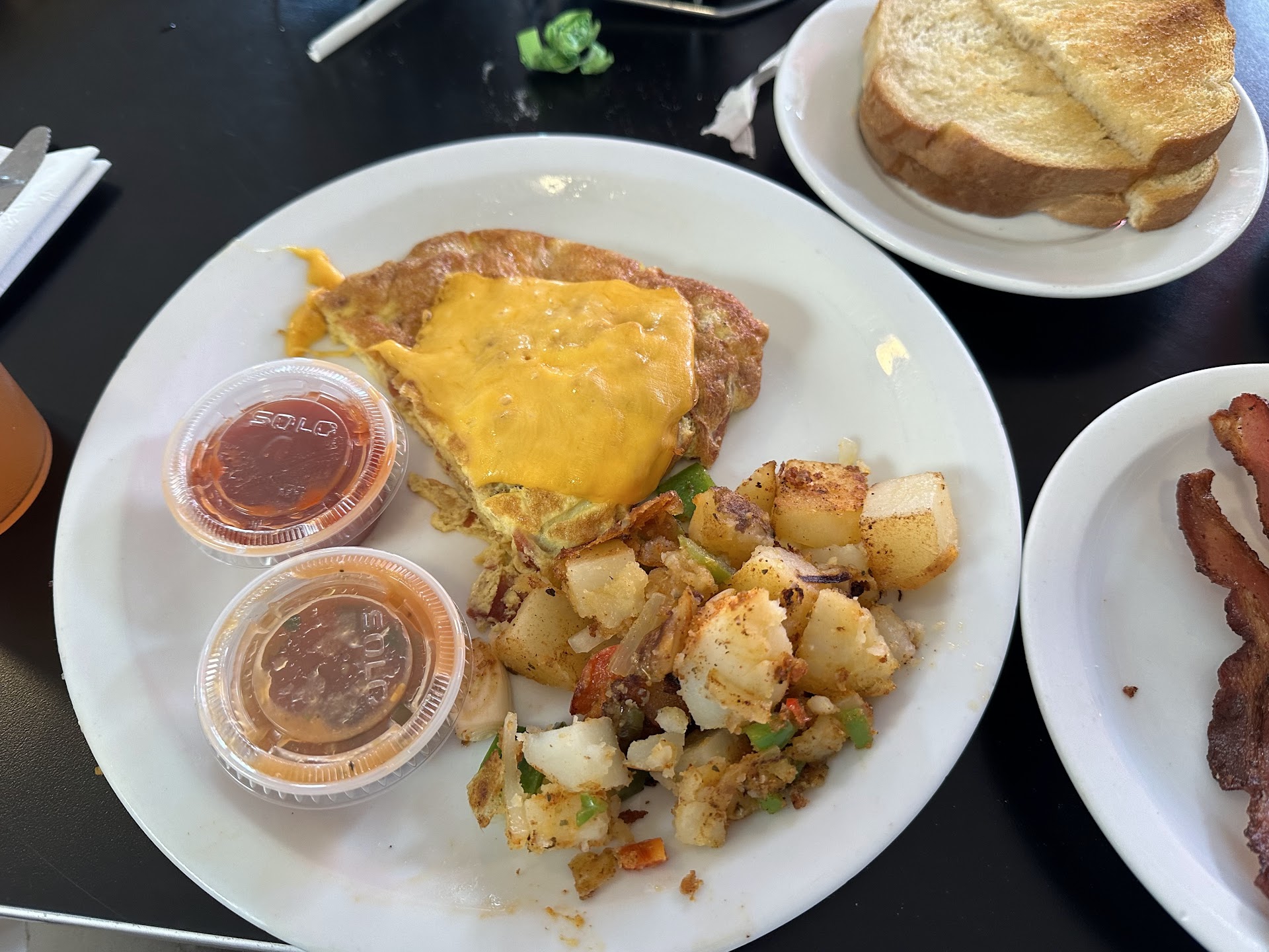 It came with home fries (also could choose cottage cheese or hash browns), and toast (we picked sourdough). I added a side of bacon and side of sausage patties.