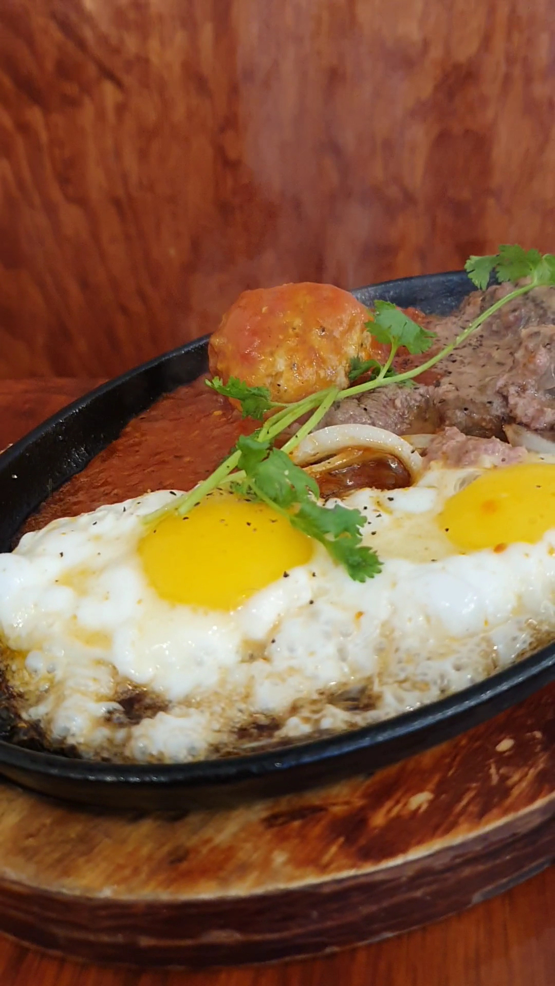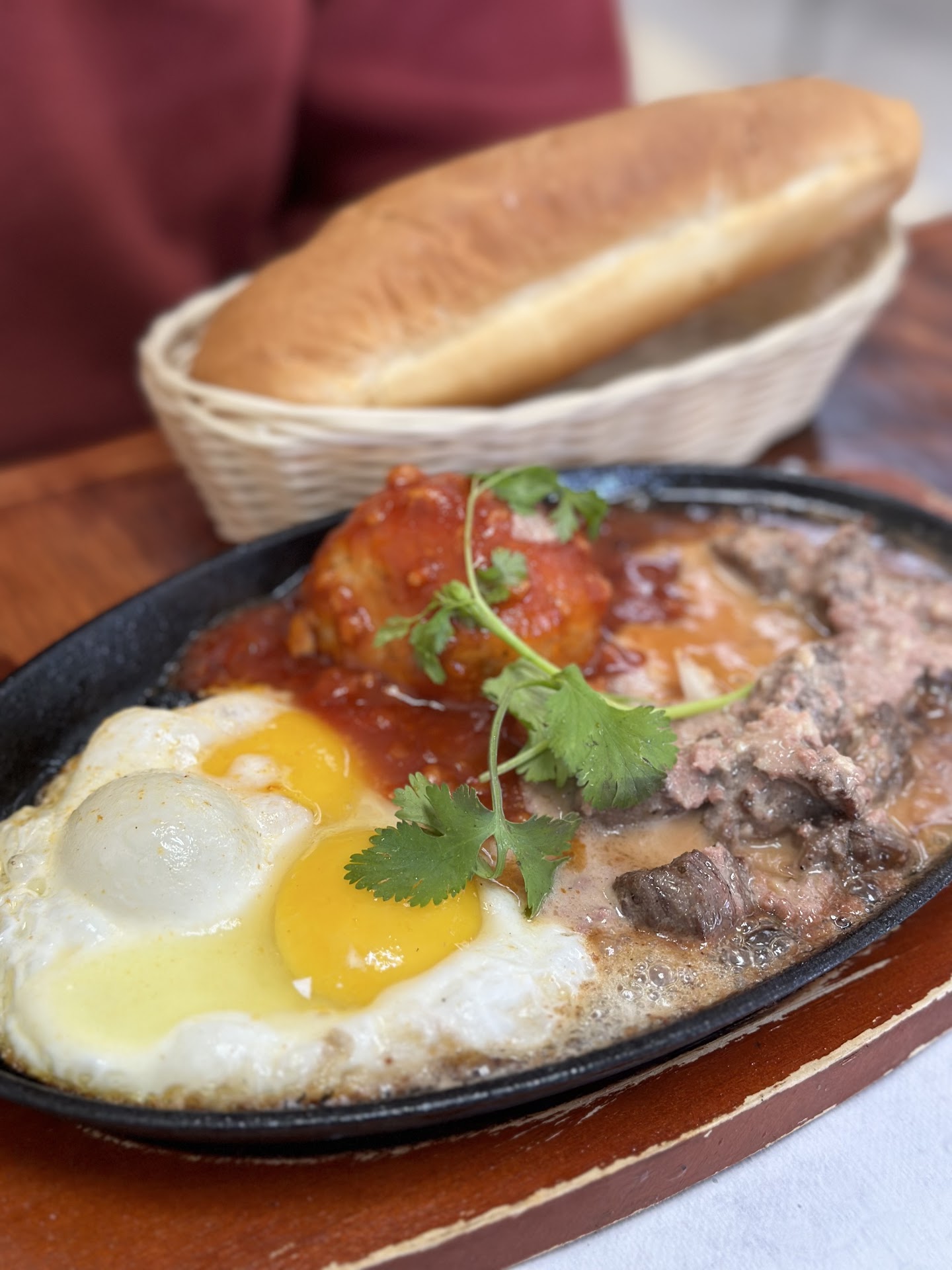 BANH MI CHAO - French bread served on a hot plate with Xiu Mai Meat in tomato sauce and filet, egg and dip the bread with the sauce! Perfection! So much umami in a bite - filet was delicious as well! The Xiu Mai inside was a bit cold though wish it was hotter
