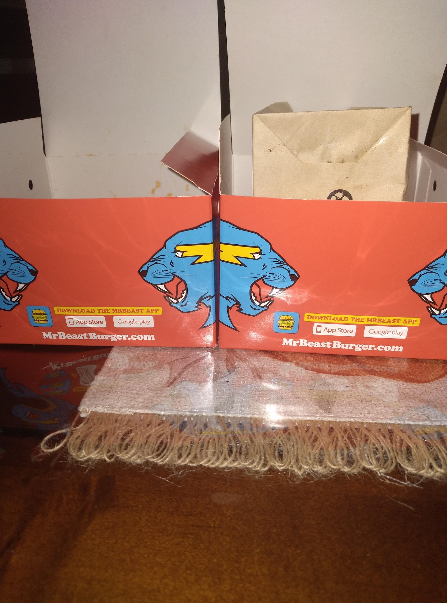 Ā Ā Ā Read moreAfter finding that there was a Mr. Beast Burger near me, I placed an order through UberEats to surprise my son when he got home. I ordered the Chris style (it has bacon!) and the Beast fries. When it arrived, the food smelled so good that all my son got was the Mr. Beast Burger BAG that the food came in! (Don't judge me, I was hungry!) Lol...he was so excited there was a location near us, he wanted to take the bag to school to show his buddies! Instead, we just peeled the stickers from the Burger cartons to put on his folder! š I'll add that they sell the MrBeast Feastables chocolate bars at the Walmart near me, and they are REALLY good! I was surprised, actually. Thanks, Jimmy! Keep up...