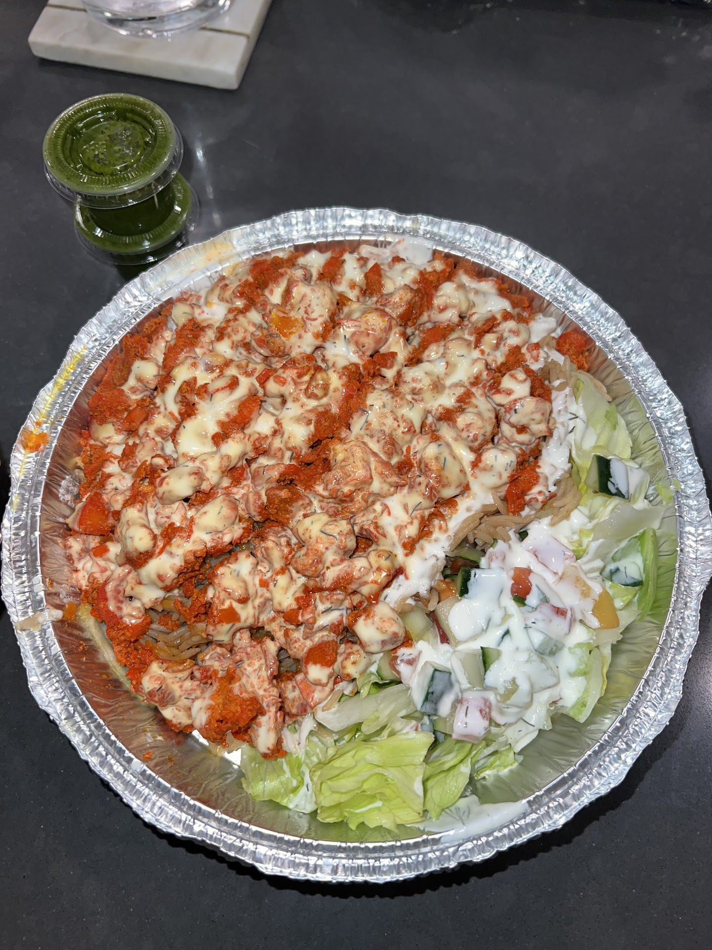 Chicken Platter - served with fluffy rice, cucumbers, tomatoes, and lettuce salad. My partner asked for white and green sauce. He liked the white sauce better than the green sauce. The green sauce is spicy and tasted citrusy. I also tried the chicken and rice, and we both enjoyed it. The chicken and rice were cooked well.