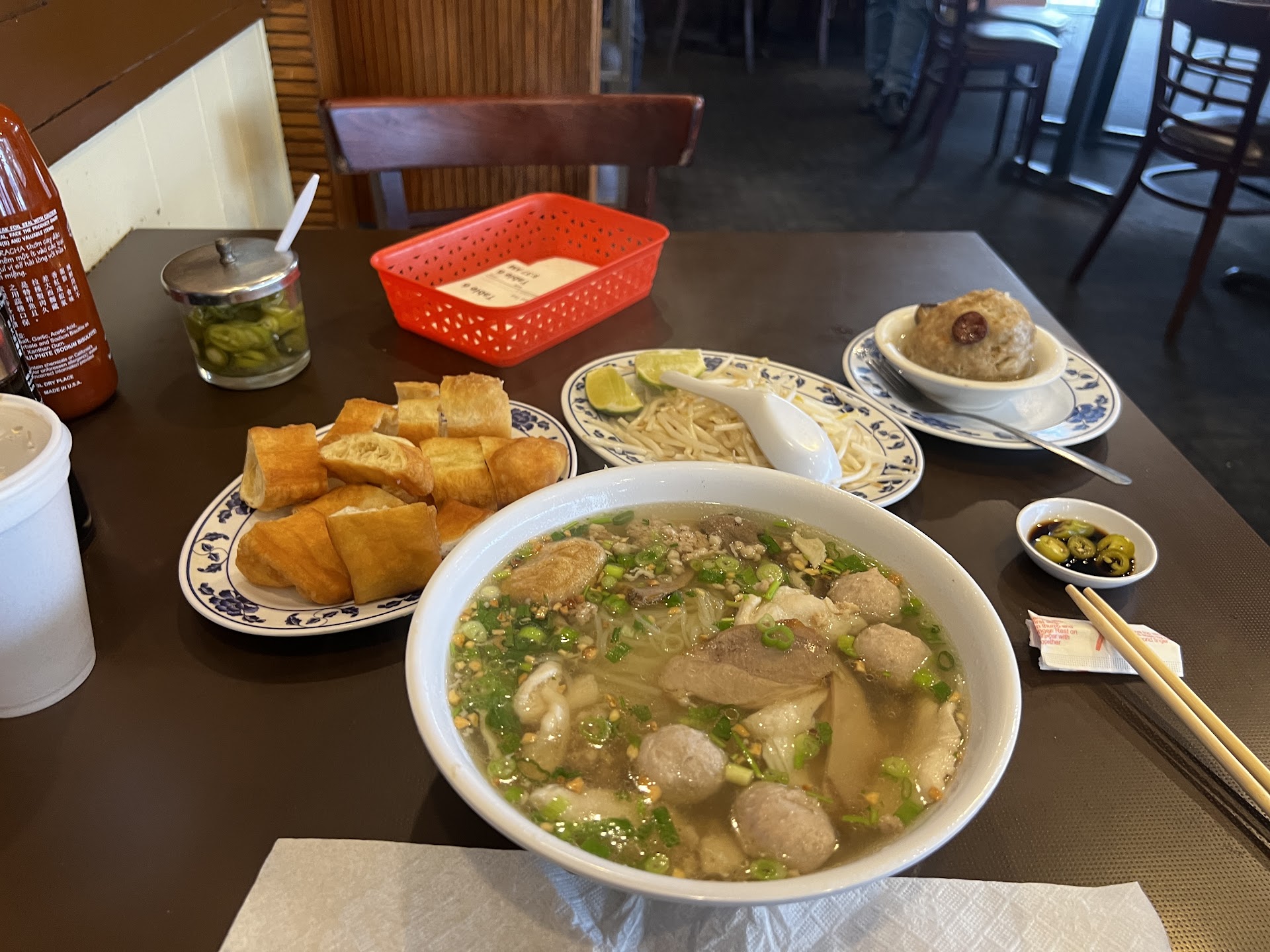 The Hu Tieu Trieru Chau (First item on the menu) is simple , but excellent. It's not mind blowing but I grew up on this stuff when I was living in Alhambra. Sadly, nothing comes close where I currently live. They will ask you if you want the thick or thin noodles. (I had to listen carefully because they will not speak English to you if you look Asian). A few small shrimps, some ground pork meat, some fish balls and a few flavorings, it's really good ($5.50)