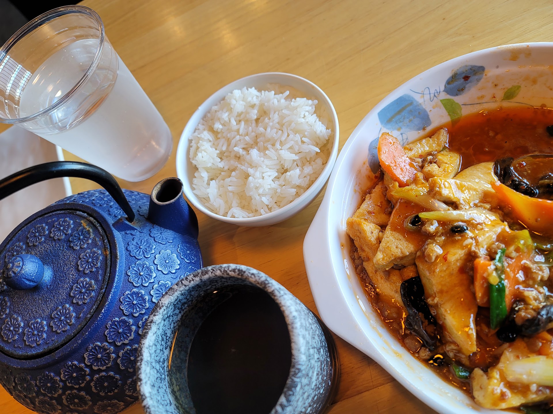The food is not greasy and it is flavorful. The food was served hot with a nice balance of ingreadients. The portion size is very fair relative to the price. Also, they do give free white rice with the entree when you dine in. On top of that, the hot green tea was served piping hot and it is free when you dine in with the entre. You just have to ask.