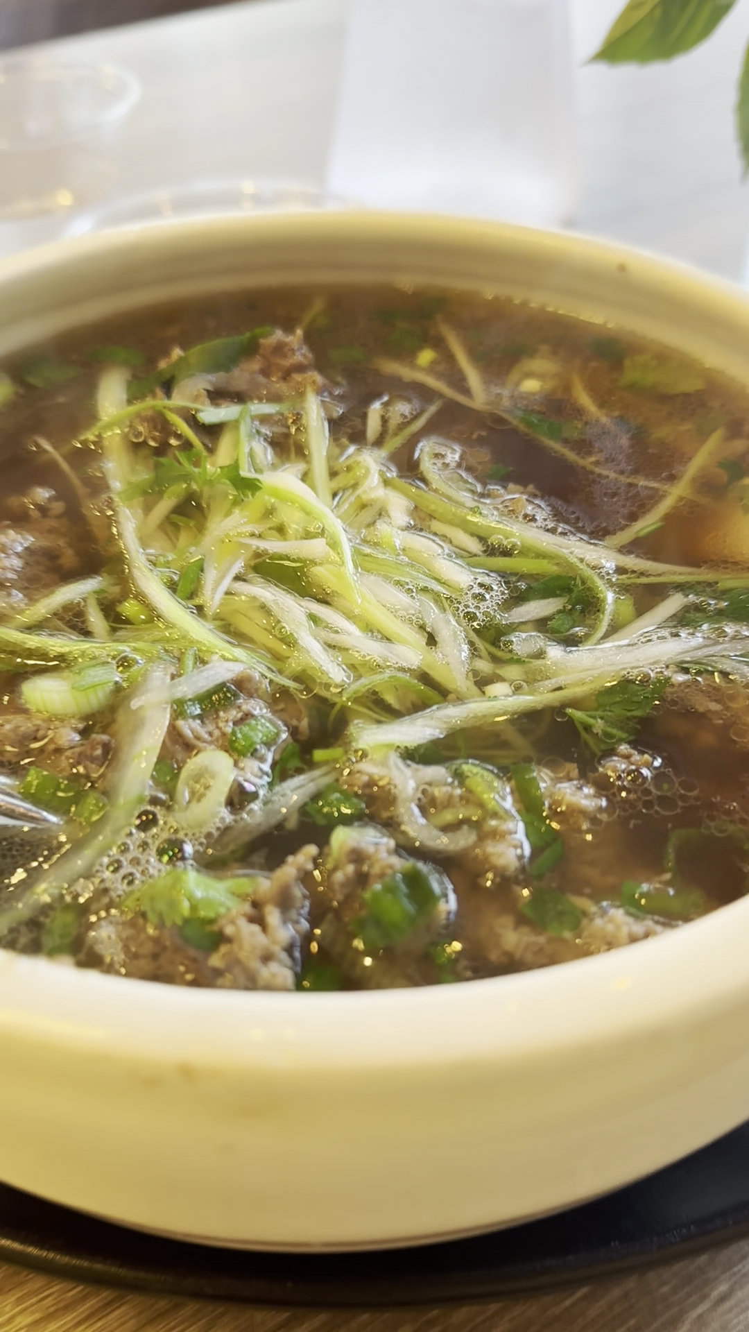 They took over the former Pho Bros and kept the same decor and furniture. The menu is kept simple and all they serve is pho in these Instagramable three layer stackable bowls. Pho soup bowl as the bottom, herbs (bean sprouts, culantro, jalapeño) as the middle and the sriracha + hoisin sauce as the top. With a side of basil in a water vase.
