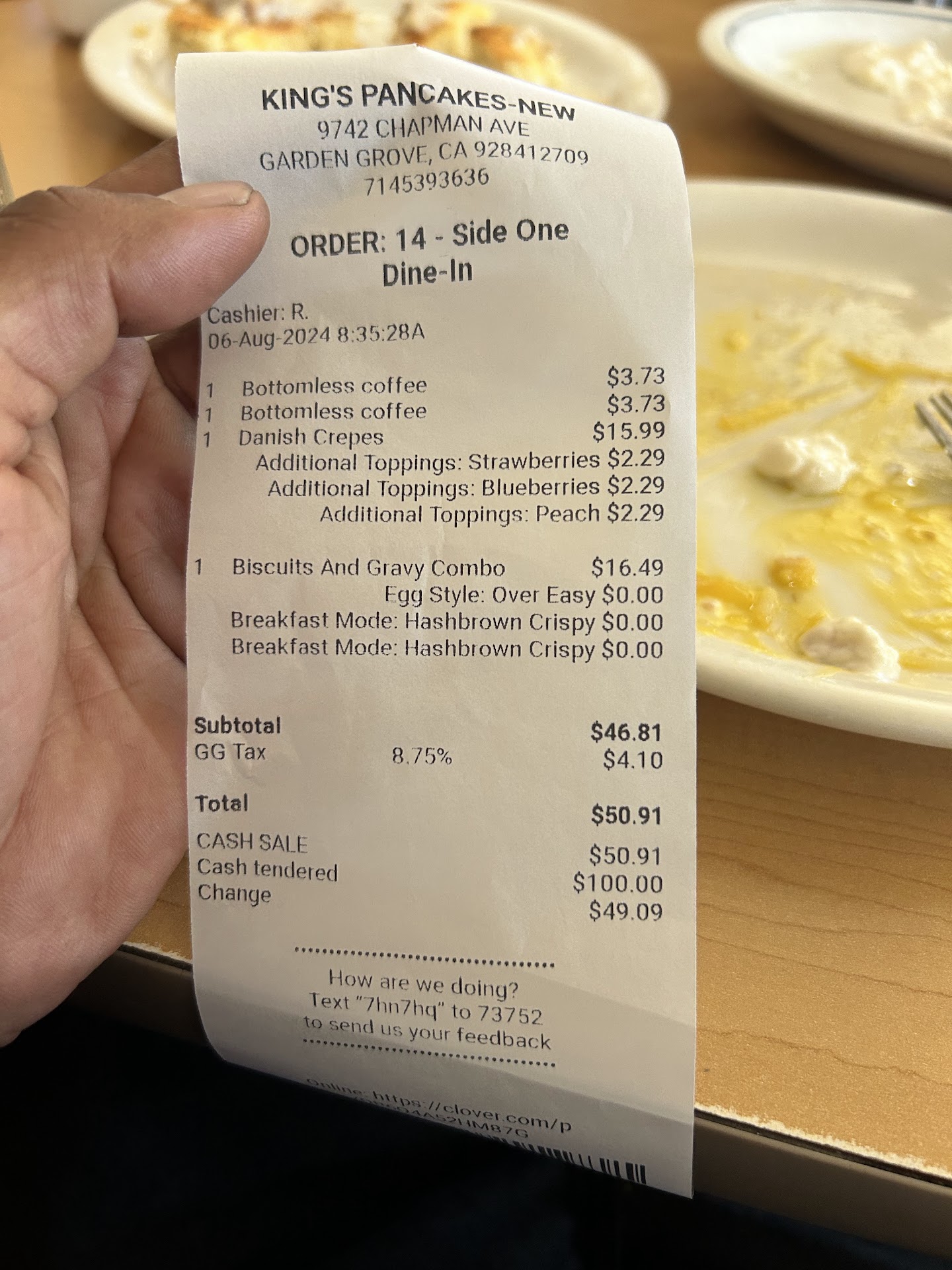 I came in here really excited to eat crepes at 8:30 ish on 8/6/24. My husband ordered the biscuits & gravy plate, I asked for the danish crepes. When I was ordering, the waiter asked me if I wanted blueberry or the strawberry, peach, blueberry trio. I said the trio which I thought was really nice because I didn’t know I had that option. Food came, both the crepes and biscuits & gravy plates were DELICIOUS. Here comes the bill and we see we were charged 2.29 for each of the three toppings on the danish crepes. Had I known it was extra, I wouldn’t have gotten the trio but the waiter OFFERED and didn’t mention they were considered extra toppings. So my plate of crepes went from $16 to $23. Great food but just can’t believe the waiter would offer something that seemed like an option and then it’s extra? PLUS, If the blueberry was a regular price option, why would you charge that as an additional topping? It should have been only 2 additional toppings. I was ready to come back to eat here again until I saw the bill. I would rather stay away if you’re going to charge me dollars for cents of toppings and not tell me when...