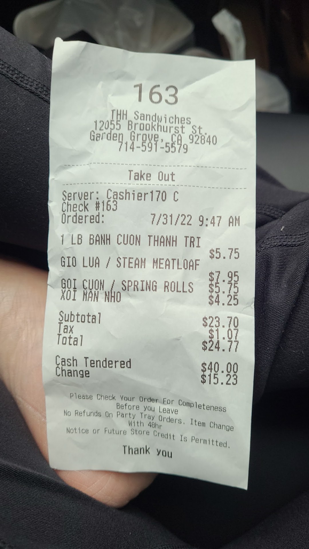 Read moreI’m so happy that there is a THH location just 8 minutes from my home. They make excellent bánh mì here and the service is always friendly. The menu is huge with options for bánh cuốn, stews, noodles, porridge, other standard to go items like spring rolls and a good size drink menu. I think the stand out is the bánh mì. The bread is flavorful, fresh, and crispy and the đặc biệt filling is perfectly portioned with meat and veggies.