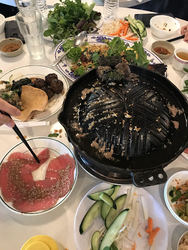 The meats or courses in general was good but not great for several reasons: 1. The meat was thinly sliced with spreaded lemongrass paste on top so it was not technically marinated therefore not giving the flavor depth. 2. It was cooked on a griddle with canned flame so didn't give much of the smokiness. Trust me that back in VN when I passed by a restaurant that a chef would grill the meat on a charcoal grill, the grilled smoke made me salivating... shrimp and squids were good. Beef patties wrapped in Betel leaves were OK, not knocking my socks off. The only course that we all agreed liking the most was the grilled meatballs from the kitchen where they were actually grilled that gave the flavors of smokiness and seasoning harmonized. The restaurant doesn't focus on the sauces, you just mix it yourself from the condiment jars on the table. The fermented anchovies sauce was not just stinky but super funky. Don't get me wrong, i can eat that sauce if prepared properly and with high quality fermented anchovies sauce. A dipping sauce in general plays very important role in a whole taste experience, so if the dipping sauce is bad then it will drag down everything else... Veggies were good, not appeared to be old or rotten. The service was pretty good, very attentive and prompt especially for Vietnamese restaurants...