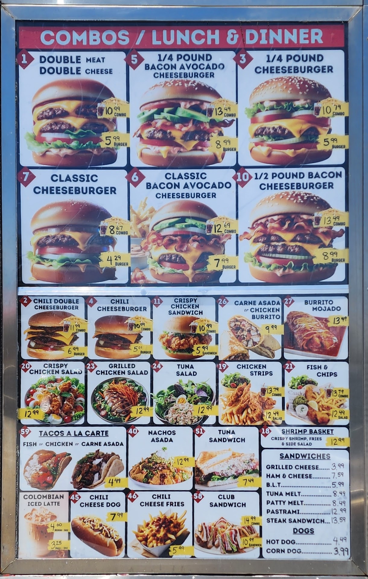 Read moreBy far the best burger deals in Anaheim. Forget Wendys (whose posters are blatant lies when it comes to their $5.00 Biggie bag) Here I get the $1.99 Cheeseburger. Yes, it is a smaller size, but still much bigger than the small burger you get at Jack N Box, and MUCH bigger then the Wendy's small burger. I add fries and a drink and it comes to about $11.00 with tax. This is actually good comfort food. At other fast food places you can spend $11.00 and still be hungry. Not only that, but drink refills are free AND this is one of the last places that still serve unsweetened Ice Tea. The service has always been friendly and prompt. The place is clean, with big, comfortable, booths. Interesting movie related posters line the walls. The $1.99 cheeseburger is a temporary discount, but the combos are actually not much more and much better than at the aforementioned fast food places. While I have stuck to the burgers so far, the menu also includes a wide variety of choices, including Mexican dishes like...