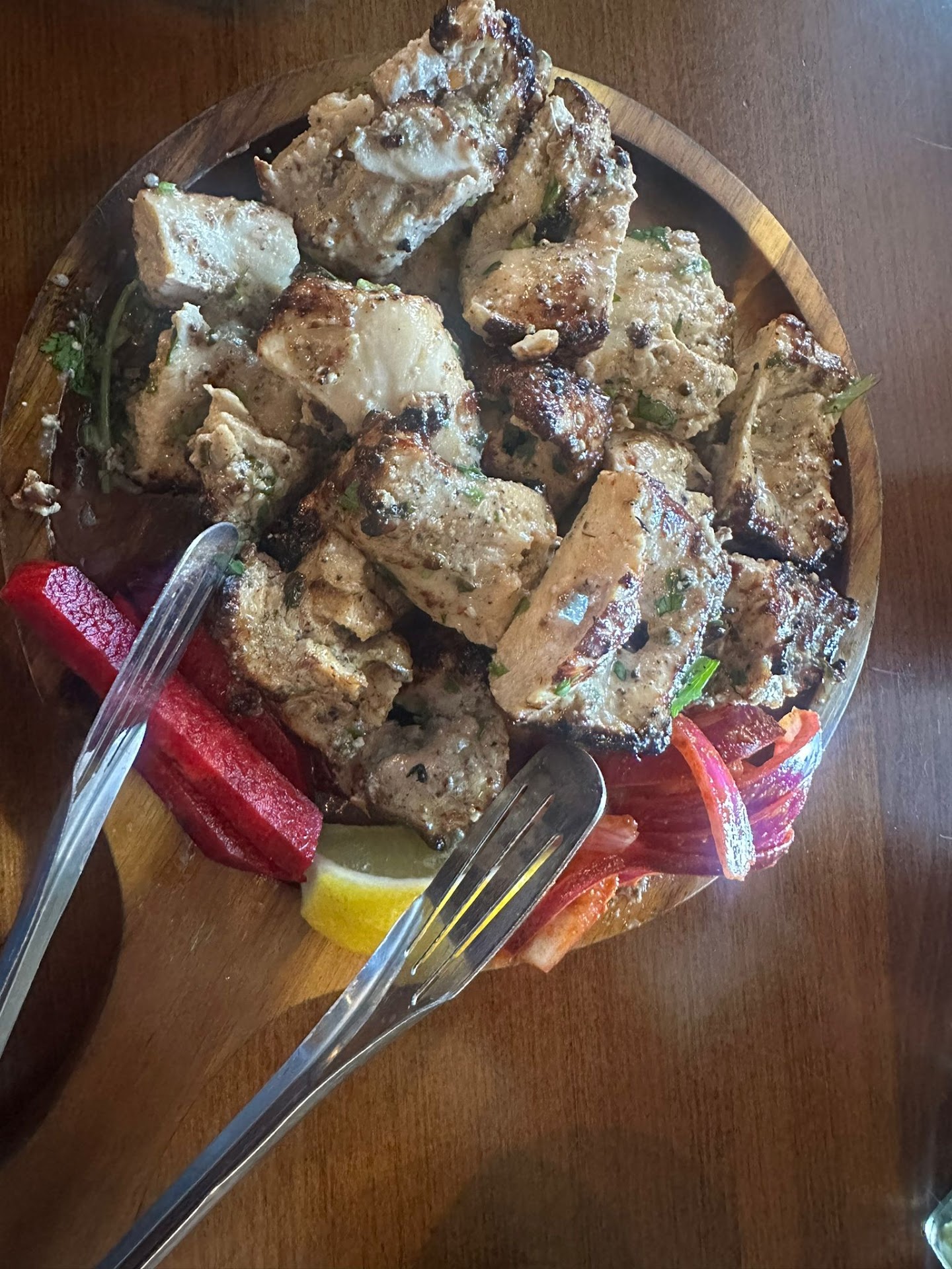 We ordered Bengan Bhartha, Malia Kofta, and Daal Makhani along with Garlic Naan, Cheese naan, and Chili paneer naan. The naans were thin and good size. The appetizers were Paneer Tikka and Pineapple Chilli. All the food was fresh and tasty. I give them 5 stars. The waiter forgot to bring drinks menu, but the owner was mind enough to comp us Jamun drink since it was my wife birthday. Again, amazing cocktails!