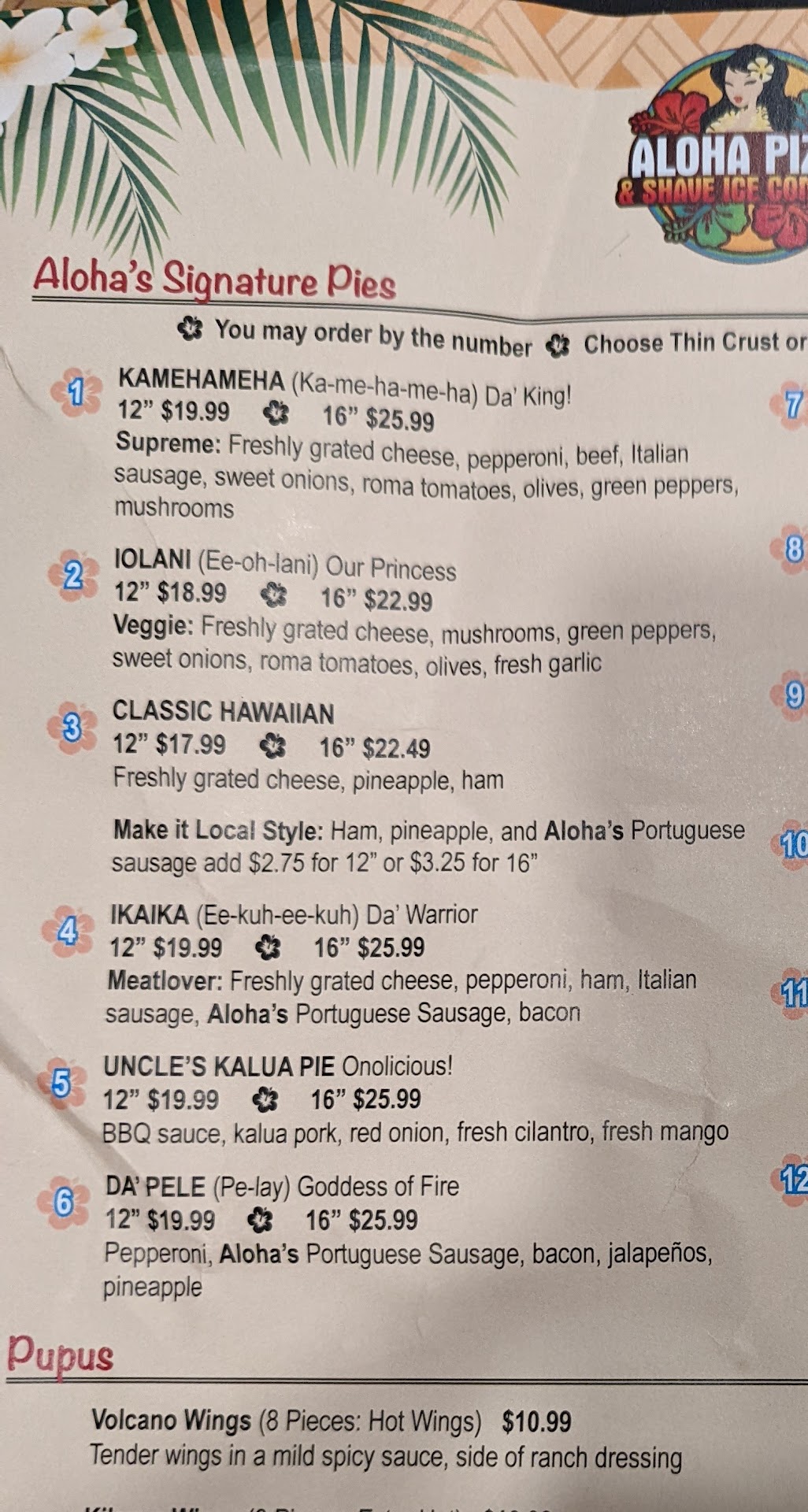 Unfortunately this place fell far behind my expectation I was so looking forward to trying their food but using the app "Chowwow" ( even stated "NO SERVICE FEES" ) was such misleading and fraudulent experience that I will never patronize this place again but I will tell you an honest truth about their food their Pizza to me and my son which is 12 years old and had nothing to lose nothing OR gain literally said it tasted like Domino's there was nothing spectacular about it...the chicken wings look like they had some kind of disease they were so small & ridiculously looking... (the pictures will say it all), their ribs were actually pretty good they gave you plenty of them there was enough to go around they were a great tasting nothing bad to say about that but their Pizza below average their chicken wings had decent flavor but I can't believe they actually serve those the way they are do not order from "Chowwow" off the Google site because there is an upcharge of anywhere from 10 to 12 to 15 dollars whatever you order and they should have something stating that which I think is so fraudulent and my order I had came out to over $52 for a 12-in Pizza which is 19.99 thru "chowwow" 24 bucks, 808 wings 10.99 thru the app 14 dlrs, Hawaiian ribs 11.99 thru the app 13.98..so tired of the consumer getting ripped off especially with things are so expensive nowadays and just having one day to go out with the family to eat and then just to get ripped off at the same time so disappointed in aloha Pizza...