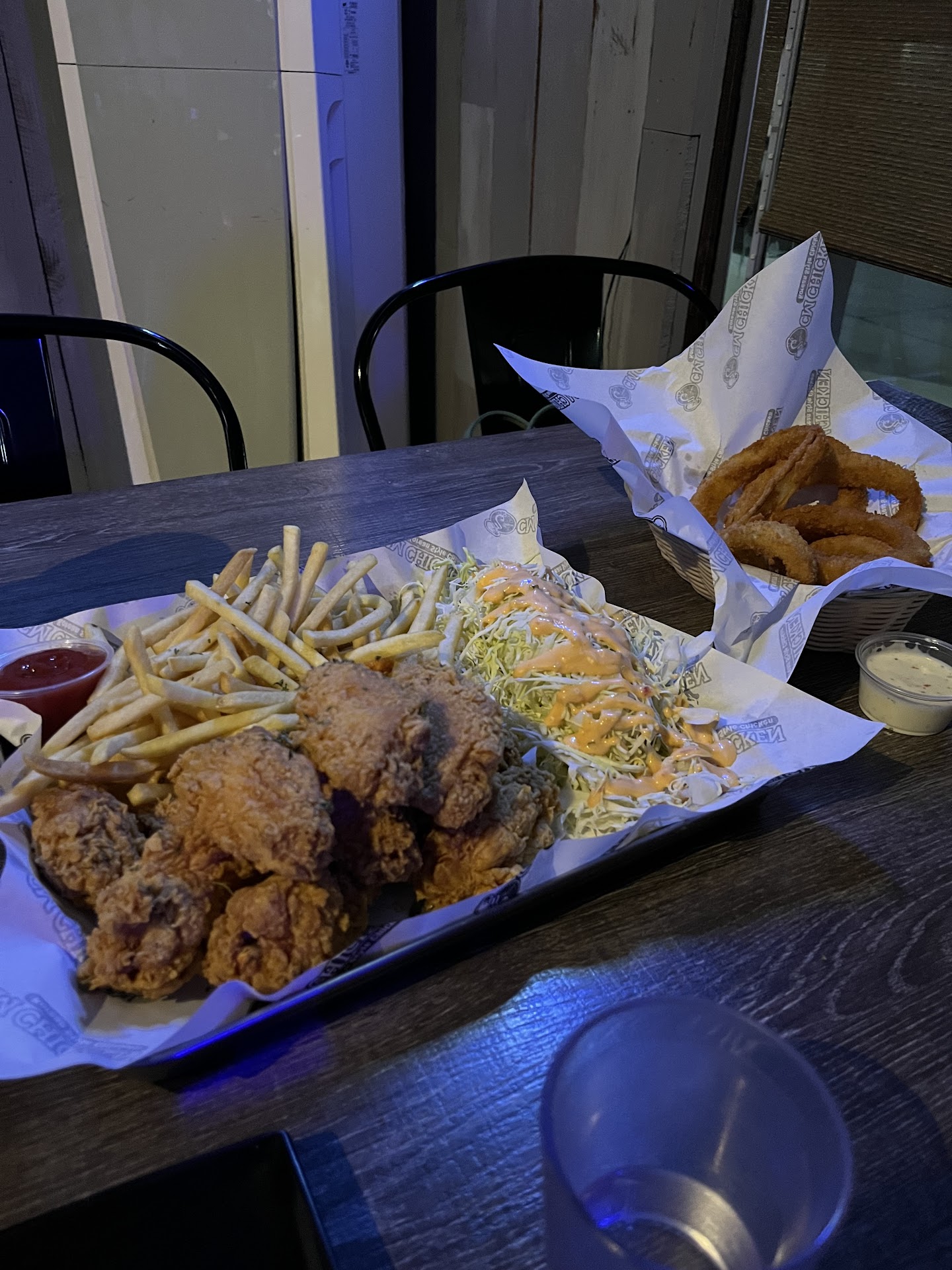 Garlic Spicy with waffle fries was the best one. It had enough spice that kept you wanting to eat more. Crunchy batter and it was also a lil bit sweet. Very saucy!