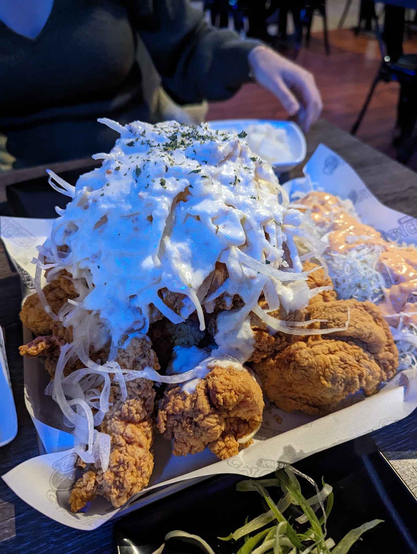 Snow Onion is my least favorite. Hella onions, so if you love that, this one is for you. Almost reminds me of the sour cream and onion flavor. It's sweet though, so I did not like that. Without the snow Onion and sauce, the base of the chicken was great. It's almost like a fried chicken from a usual joint but just wings.