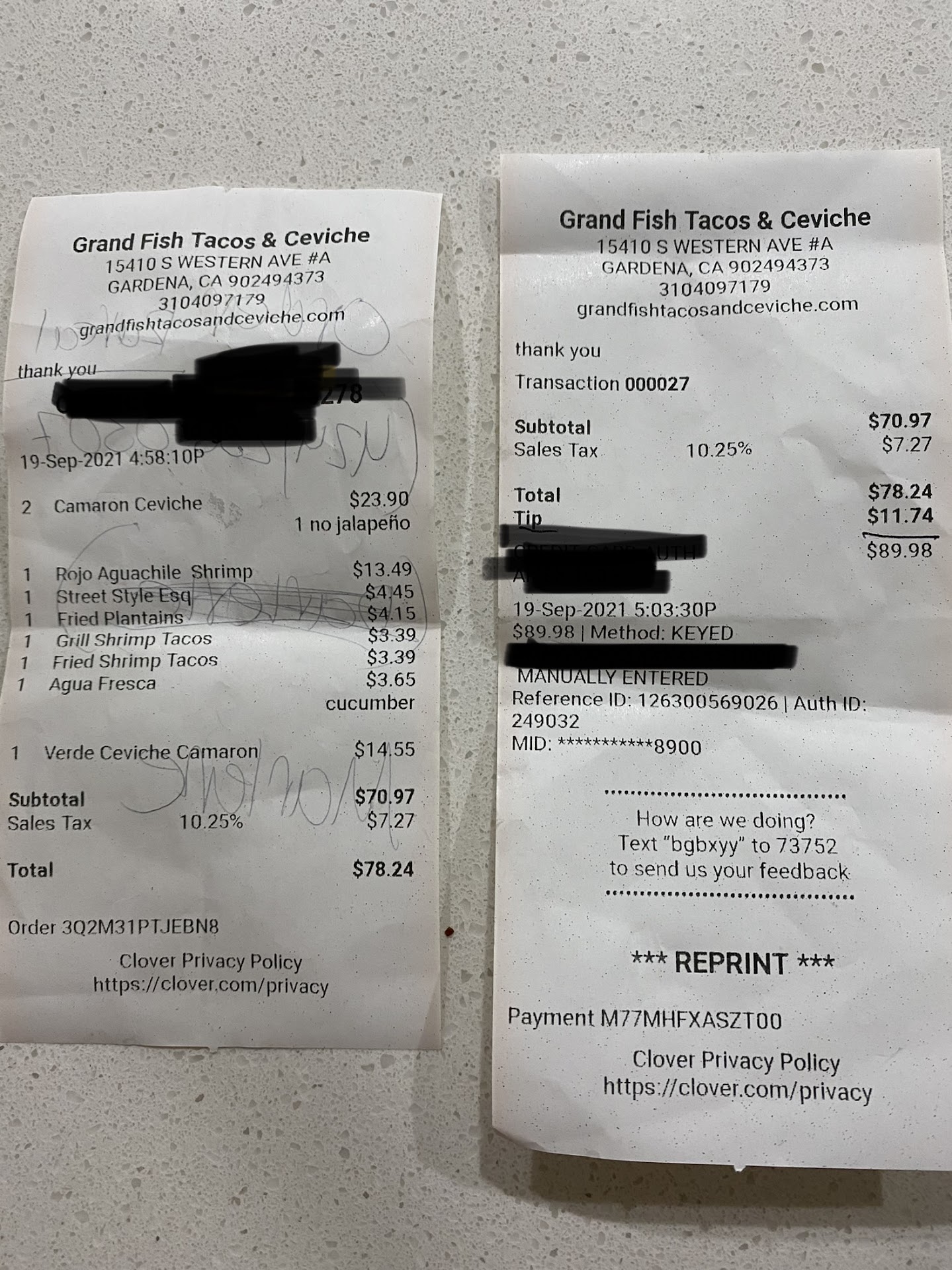 Read moreIf you are a person who pays with a credit card I highly suggest you don't use it at this place! We used a credit card for our purchase which was $78.24. A few days later we check our account and we noticed they charged us $89.98. We DID NOT leave a tip because we always leave a cash tip. So we called the restaurant wanting an explanation. Come to find out, an employee added a $11.74 tip without our authorization. Umm, that's called stealing!? The lady that I spoke to blamed the error on the staff being young and not knowing how to do things. No lady, the staff is obviously not being trained properly and are thieves. When I went to go pick up my $11.74, the envelope only had $6. So someone took money out of the envelope! The moral of the story is to make sure to always check your accounts making sure restaurants like Grand fish tacos and ceviche aren't stealing from you. It's sad because the food is good. They didn't even offer anything for this unfortunate event. Not saying that they're obligated, but that's what a good...
