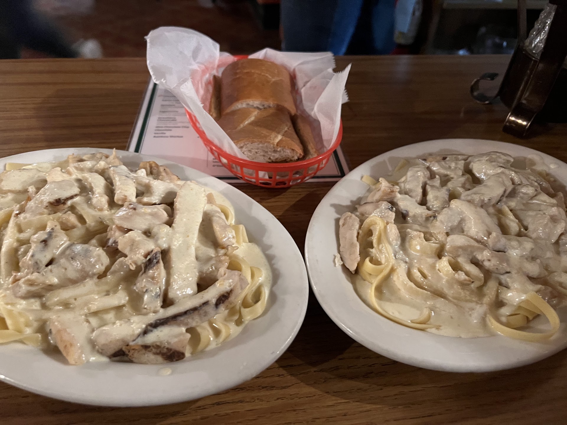 The food was seasoned very nicely - while the Alfredo sauce could have been a little richer and thicker, it was better than a lot of places weāve tried. And the chicken was seasoned perfectly, enhancing the overall flavor of the dish. The garlic bread was spot on and very good.