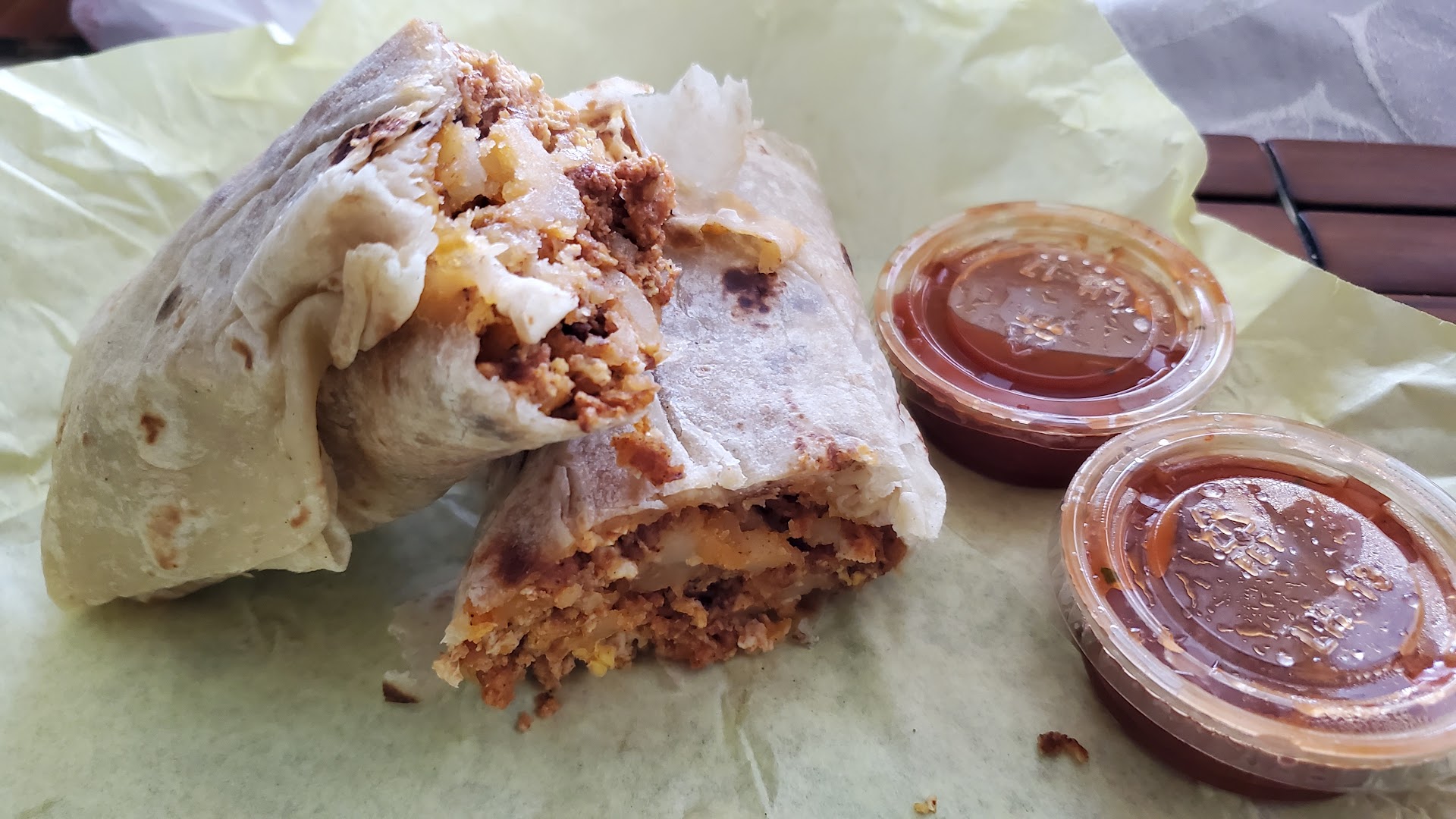 I couldn't wait to get home since it smells so delicious and it was hot. It was still very warm when I got home. The burritos are very nice size and portions. The chorizo was loaded, they did not skimp at all. Flavorful! And the tortilla is so awesome. I think they make it fresh in house.The salsa was perfect. It was so filling and already full that I didn't even get to eat the steak burritos. I saved...