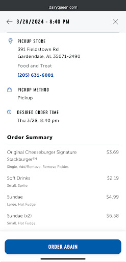 Read moreThis is by far the worst DQ I've ever been to. Walked in and waited for 3 minutes before anyone at the counter even acknowledged me...and I was the only customer! The cashier had to be new because he was a bit slow on the register. No big deal there. We all have to learn some time. He messed up my order and forgot my drink, but added a blizzard...I didn't know he didn't charge me for the drink, and asked for my cup. He didn't hear me or ignored me. They're right there on the counter so I reached for my cup. The manager stepped up and told the cashier that he needed to hand the customers their cups. The cashier said he didn't charge me for it. The manager looked at the register, I guess to review the COMBO WITH DRINK, and then told me I didn't order it, and told me I needed to pay for it. The food came out somewhat cold, even though I was reassured it would be made to order... They have the self serve fountain drink dispenser with all the extra flavors, and every time I've been in there, they are always out of the new flavors. Just basic cola. What's the point? DQ should be embarrassed that this person represents...