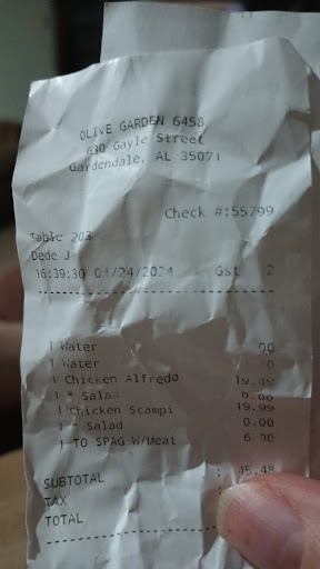 Read moreWe live between this Olive Garden and the one in Decatur. Let's start off with service. Our server continually talked over us. She sat at the table with my wife and mother-in-law to get our drink orders while I was in the bathroom. It made my wife very nervous and uncomfortable. We have been to Olive Garden in Ohio, Virginia, Tennessee, Indiana, and Maryland. NEVER had a server sit with us to take an order. I chose chicken nokee..soup. I'm sure that's spelled wrong. It was very very watery and had grease floating on top. My wife ordered eggplant parmigiana for her entree. The eggplant was very greasy and undercooked. We brought it to our servers attention and her idea to remedy the situation was to bring her the dish deconstructed. NEVER have we ever seen that. It was ridiculous. My wife was tired with the entire issue and ate on salad while we ate. My mother in law got the spaghetti with meatballs. The meatballs were desert dry. My father in law had the shrimp pasta dish. His was okay. I ordered the 3 meat manicotti. Not enough sauce on it. Manicotti shells were overcooked and tough. The server had a comeback from everything we brought up. The server NEVER asked or offered to refill our drinks. We asked for to go drinks. She brought out cups for us to put our drinks into. Only one problem. My father in law and I had empty glasses. I asked for a drink to go. She looked right past me as if I didn't say anything saying our bills were ready to checkout on the table kiosk. The whole reason we were in the Gardendale area is because a family member had been in the hospital for 10 days and we were on the way home to Cullman. The outcome at the hospital wasn't what we were hoping for and this sure visit to Olive Garden didn't make it any better. I will not be back to this Olive Garden. This is not the Olive Garden experience we are use to. I do not recommend this location. And if asked, I will not recommend it. Server and food was a big fail. I guess the lack of cars in the parking lot and lack of people in the restaurant during hours they should have been busy was a...