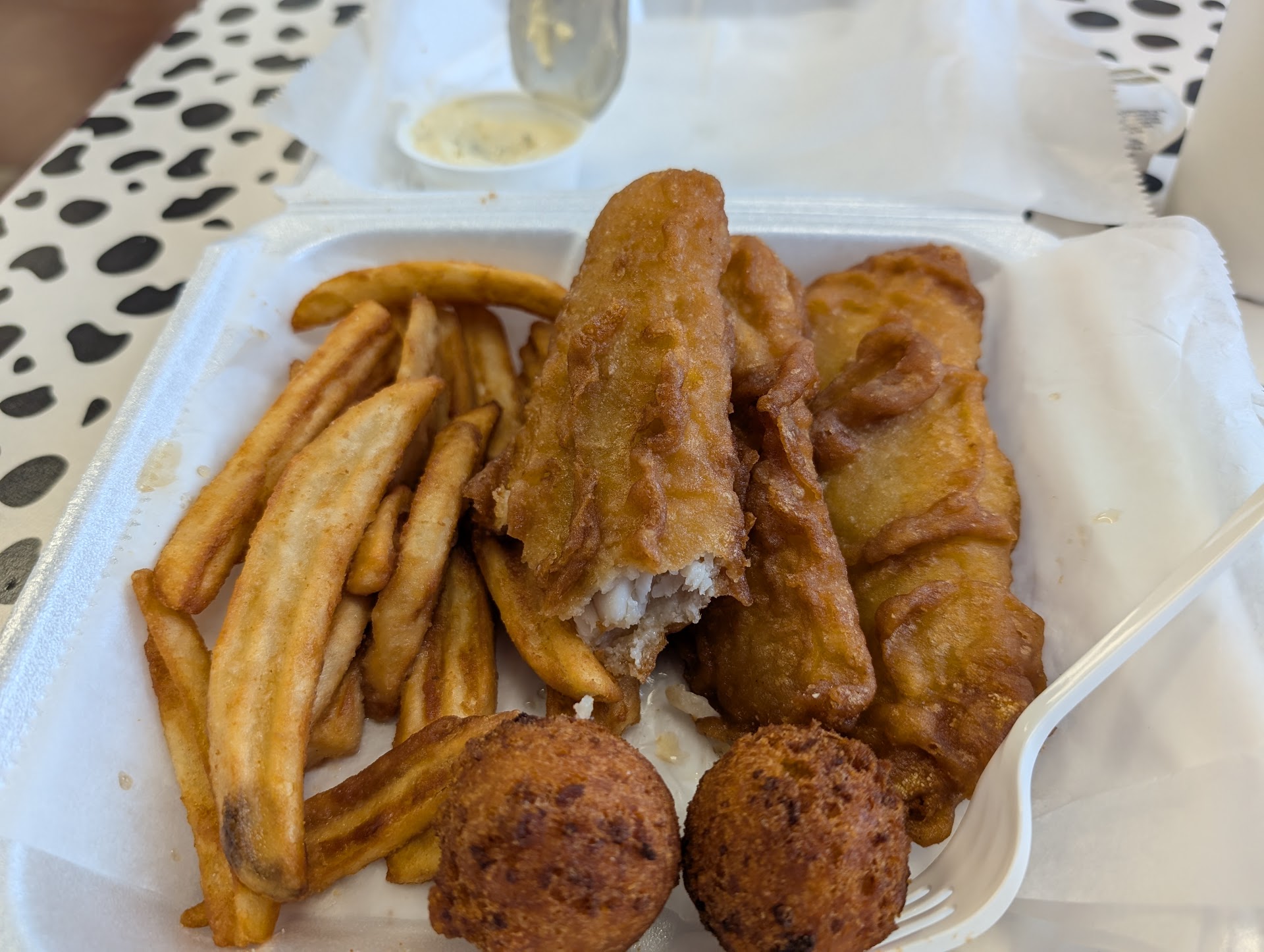 Now, the fish is the exact way I remembered light & crispy, the fries also the same O.M.G the hush puppies tasted the same, the gentleman who I assume was the manager came out asked how was our meal & refilled our pop even gave my grandson a lemonade & a cardboard boat which he really loved. Very clean place, tables were cleaned as soon as the customer left, men's restroom was clean, the service we recieved was top notch.
