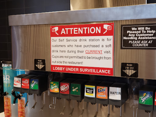Read moreThank you, McDonalds, for making us all feel a little bit like criminals. Your "LOBBY UNDER SURVEILLANCE" sign is more prominently displayed than your allergen information, your "we are pleased to help" sign, and your menu. It is nice to know we are being watched by a giant corporation that is more concerned over losing 10 cents on a soda than getting my meal correct. I understand that beverage thievery is one of the newest plagues to sweep our great nation. It has likely affected your profits in ways I can't even comprehend. It is good to know that your company places the greatest emphasis on preventing this. I sleep better at night knowing that your company mission is "Drink Dispenser Surveillance" and not, you know, making acceptable food or something dumb like that. Or at least making us the correct unacceptable food that we...