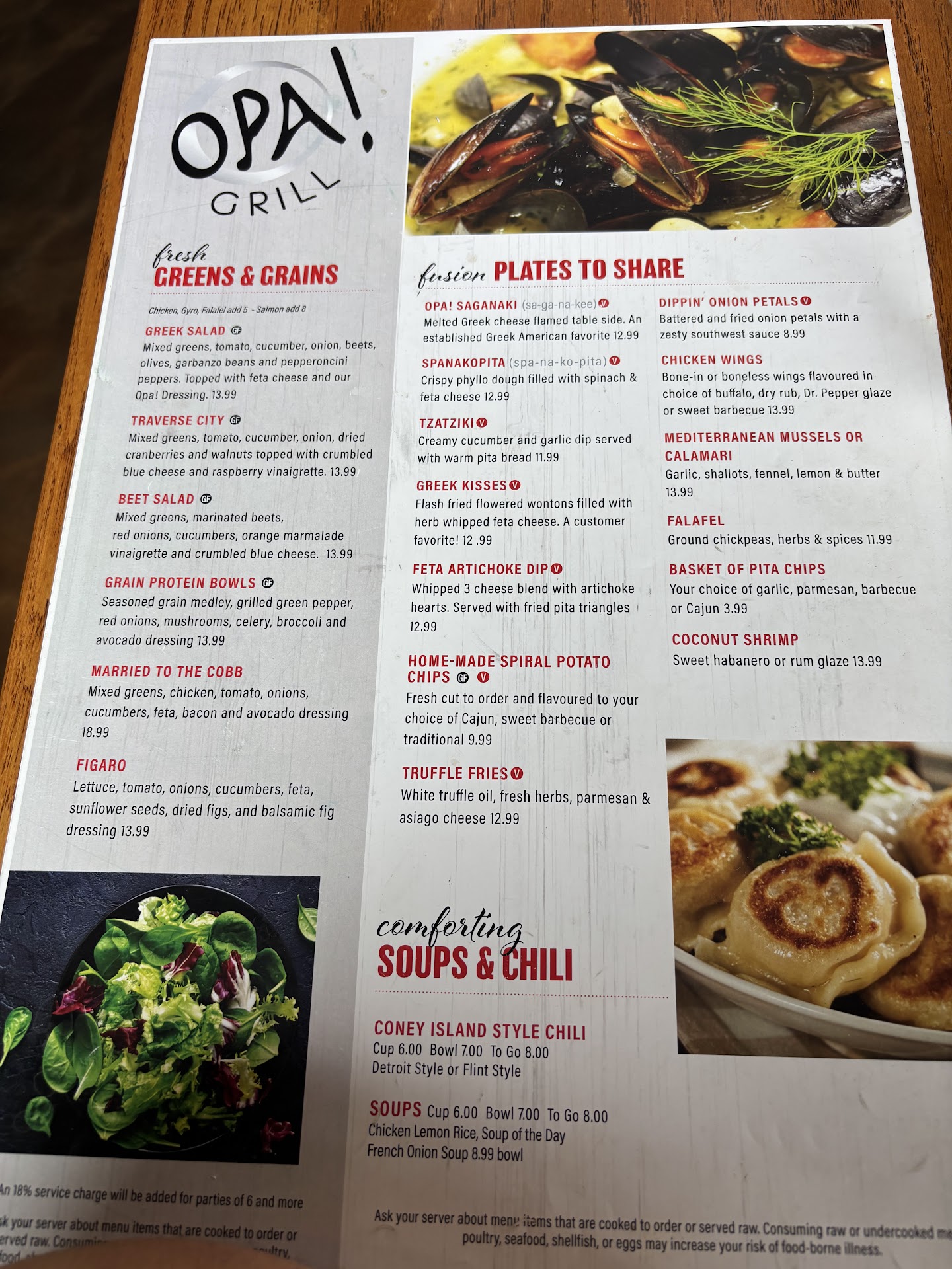 We overheard a table behind us order the Phyllo Wrapped Coconut Shrimp and I noticed Brandon turn his back to our table and quietly inform the couple that Opa was out of that item and could they please select another item. Gee, I wonder why Brandon works here? He was a great server with enthusiasm and very attentive but his services could be appreciated elsewhere that knows how to run a restaurant. He did tell us as we were leaving that he informed the GM who had just called to see how things were going, about the missing items. My thoughts, why is the GM not here on a Saturday night to see for himself?