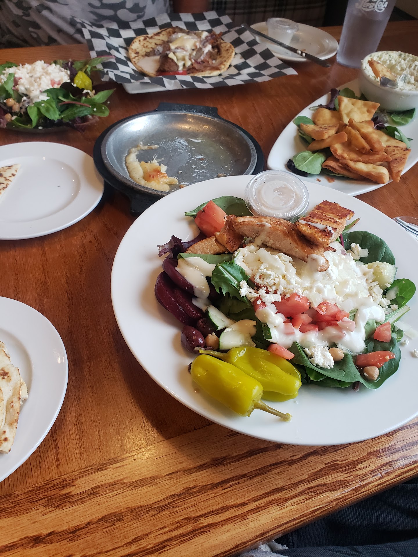 Read moreFinally this place was open when we were in town. The atmosphere was so nice I did not think to ask details about the salmon when ordering a large Greek salad. I did ask the waiter if he recommended salmon or gyro meat and he said he really likes the salmon. The salad came out and the presentation was amazing. The vegetables were very fresh and beautiful and piled high. There was a lot of feta cheese. However the salmon tasted fishy and it made me then question its origin. I asked him if it was farm-raised and he went and asked, then told me it is "Atlantic salmon", which is the name of the fish and tells me nothing. Or it tells me that my suspicions are likely true. It reminded me of Aldi's "Atlantic salmon" (farm raised junk), and I found a little white froth left in the folds of the fish. The dressing on the Greek salad tastes like mayonnaise with some sugar, very unappetizing. It felt like very "Americanized" Greek food. We ordered two appetizers, saganaki and artichoke dip. They were okay but nothing amazing. The Greek cheese on fire is hard to screw up, however the pita bread was bland and not super amazing like we would be accustomed to at a specialty Greek restaurant. The artichoke dip lacked any taste of artichoke whatsoever. My boyfriend ordered a Swiss and onion gyro and said it was just okay. We would prefer any other Greek restaurant to this one any day. And when the waiter was alerted to the salmon tasting fishy his repy was, "it is not my fault". I would never recommend this place to anyone, unless they are looking for esthetics, bells and whistles. This place was lacking substance, authenticity, basic customer service skills and high quality, authentic delicious...