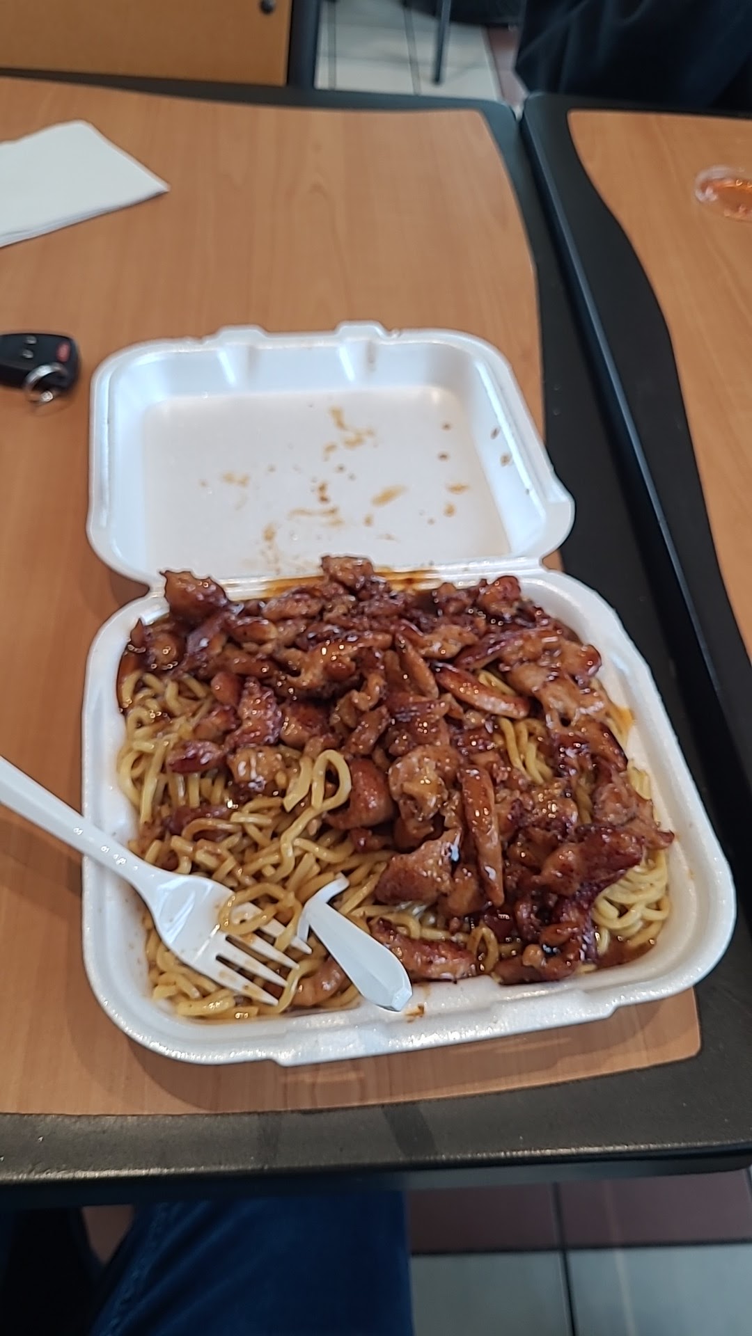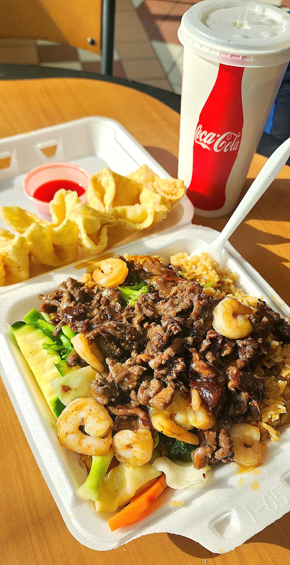 I arrived at Noon as that is my lunch hour and expected freshly prepared food. I ordered the Chicken and Shrimp teriyaki with vegetables and noodles and a side order of cream cheese rangoon.