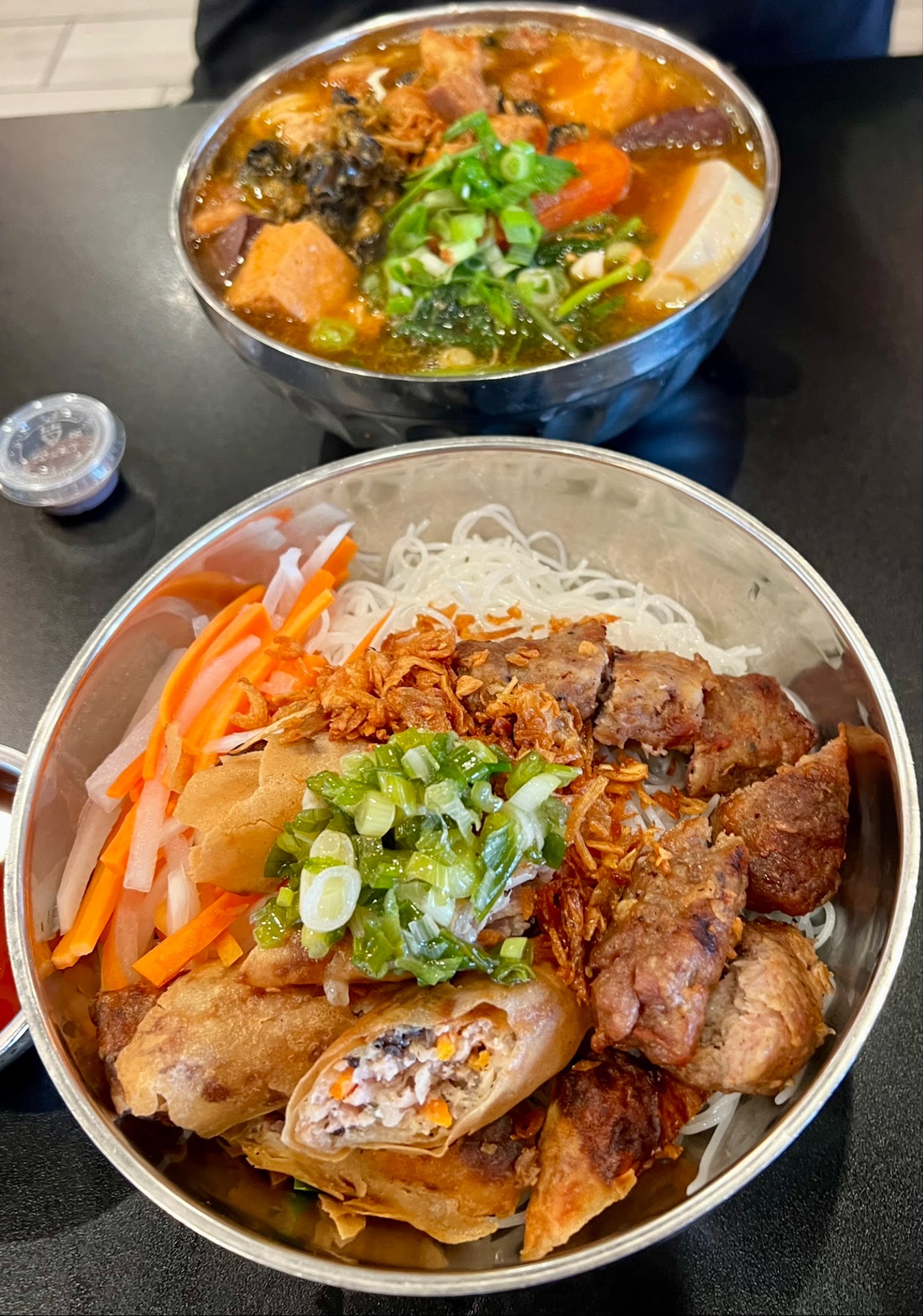 We tried the spicy beef and cahn bun Oc and both had bold flavors. Make sure you add the shrimp paste that comes on the side. Both broths were sweet and savory and had an umami bomb. We added chilli to it and it took the soup to the next level.