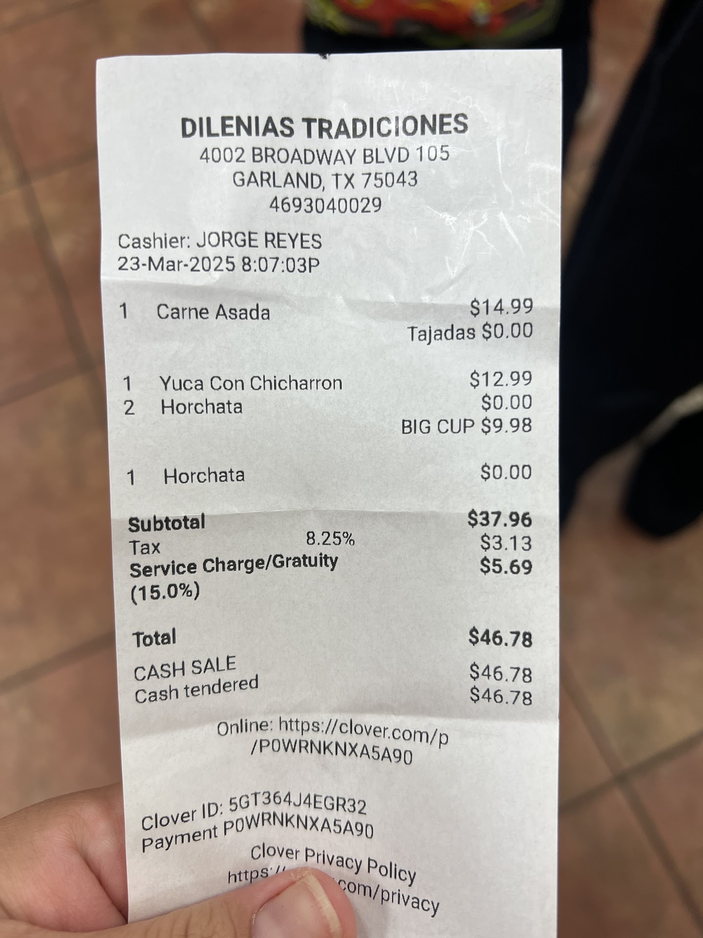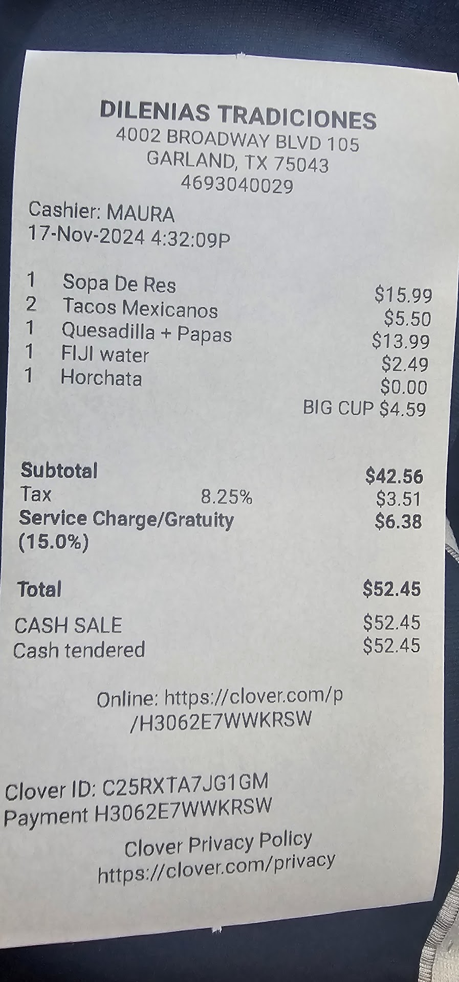 I always try to eat local when I can. I visited this restaurant for the first time this past Sunday around 4 pm. The restaurant was completely empty but we were greeted and seated by this young lady. She didn't speak English very well, but we were able to order our food. A soup, chicken quesadilla, 2 single tacos, a large horchata and a cup of water. When it was time to pay, I went to the cashier table. She typed something on the register and told me my total. I was surprised at how high the bill was, but I figured I just totally forgot the prices. She ran my card, I added tip and signed the receipt. I then asked her to give me the detailed receipt. At this point she froze up because she knew, that in knew, something was wrong. I didn't want to make a scene so I took the receipt and walked out. I checked the receipt in my truck and noticed she charged us for "Fiji" water, which we never were given, and she also added auto gratuity. I have never heard of a table of 2 getting a 15% auto gratuity. This is also not listed on the menu. I am not looking for a refund. Just to make other customers aware. I'll just spend my money...