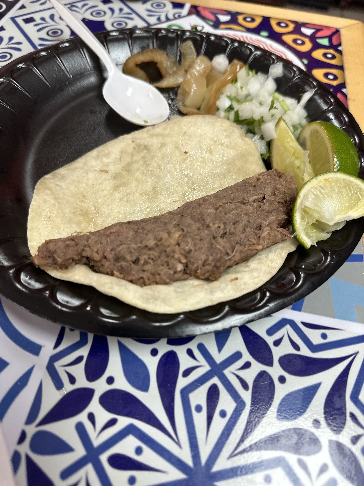 So then we go to sit down and the table is super wobbly. So I fixed the table by folding a few napkins. The tacos came out and were super small the barbacoa had water in it like it was reheated or steamed or re cooked on the grill with water. I didn’t get my potatoes either. 🙄
