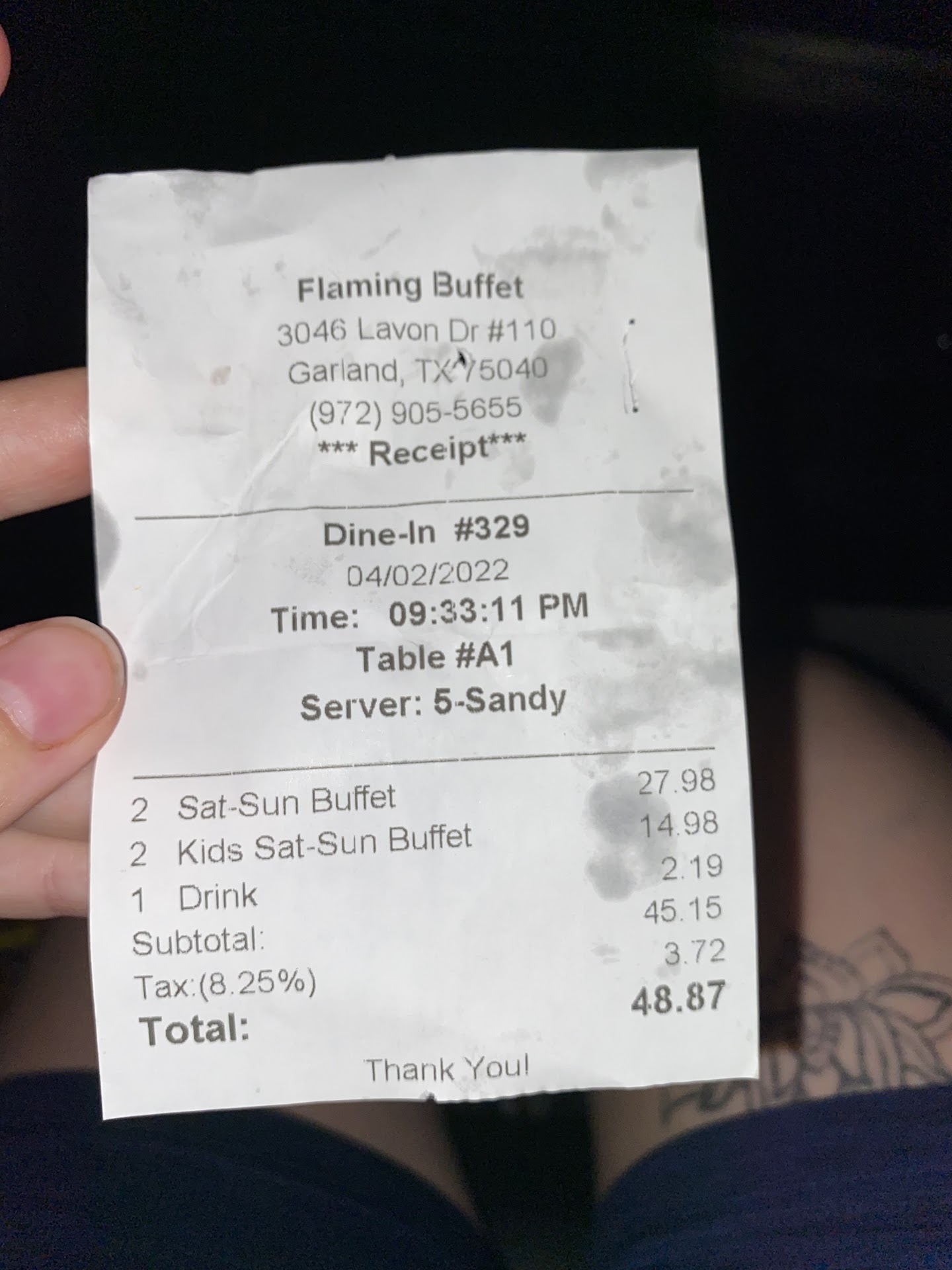 Ā Ā Ā Read moreFlaming Buffet is a good name! This place went down in flames for me . Don't be fooled by all the good reviews and five stars! That's the second worst Chinese food I've ever had. Everything looks good, presentation and looks are wonderful. But it ends there! The red sauce for sweet and sour chicken tasted fake and artificial. The tempura fried chicken was soft and flavorless . The egg rolls and spring rolls were hot and crispy and tasty on the outside, but inside there was no color or taste. The catfish fillets were nice and yellow on the outside but they were also yellow on the inside? I don't understand? I was hoping the white steamed rice was going to be Jasmine, it wasn't, it was flavorless. General Tso's chicken, jalapeno chicken, and another chicken dish were Terrible. Couldn't figure out why I was tasting muddy fish when I just had chicken on my plate. I had to spit one bite out into my napkin. Initially I was planning on going back for more to try other things. NOPE!!! One trip was enough for me. My wife said the sushi was fishy tasting. I'm writing this review about 4 hours after eating there, not sure if we have food poisoning! Both have upset stomachs. I'll stop there... Oh, you're wondering where the worst Chinese food was I've ever eaten? It's the Super King buffet by Town East Mall in Mesquite on restaurant row. Ocean Buffet in Garland at LBJ and Centerville is pretty good. I think the the Royal Buffet in Rowlett is also...